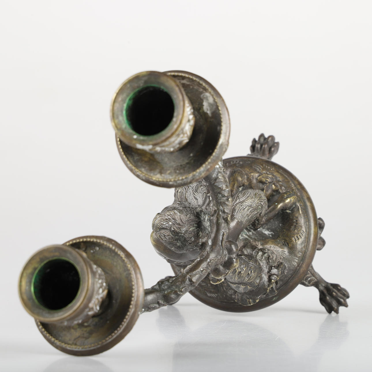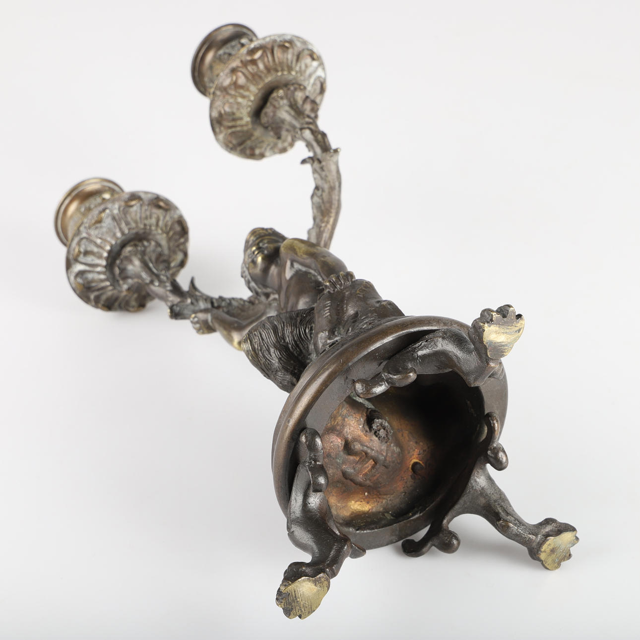 2629060. CANDELABRO, 2 brazos, sátiro en reposo, bronce.