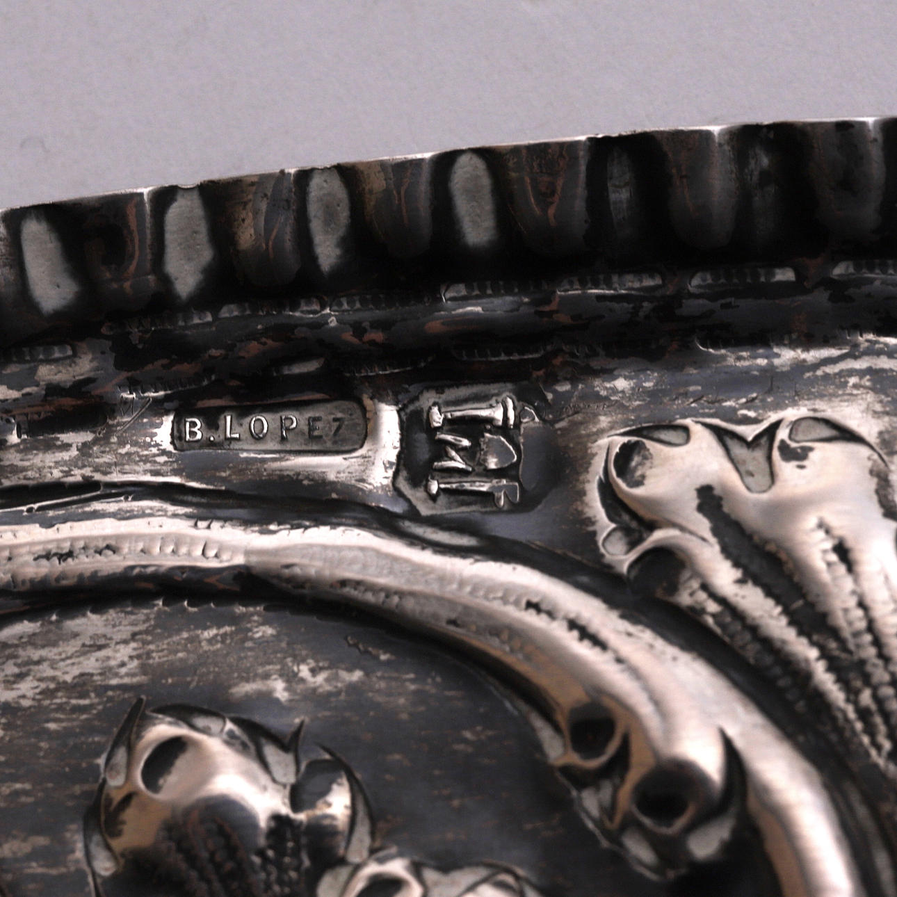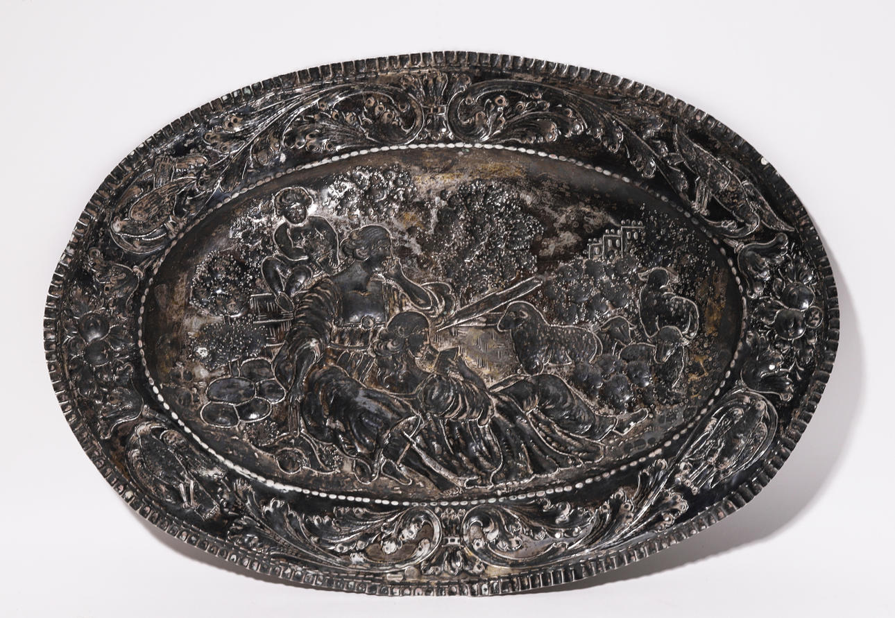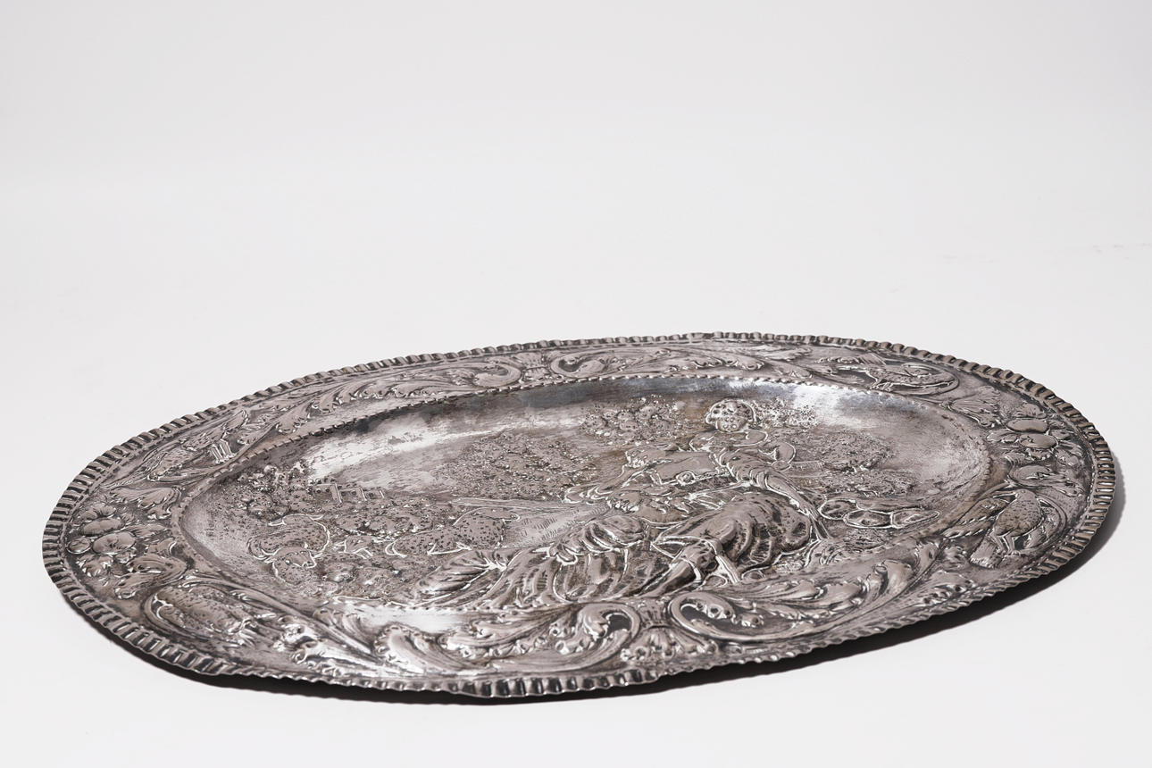 Fuente en plata repujada con escena bucólica y cenefa de aves y frutas.