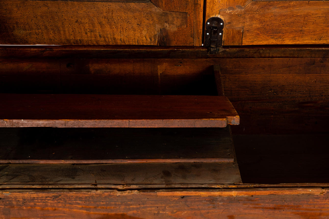 Signos de edad restaurados, rastros de daños por gusanos viejos, rastros de reparaciones, adiciones, la puerta derecha acortada en la parte superior. defectos y grietas por tensión.