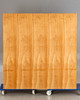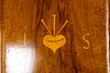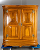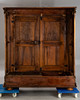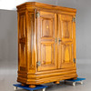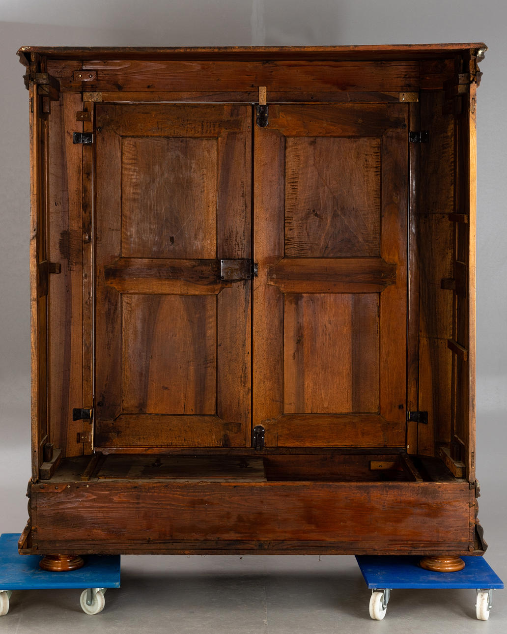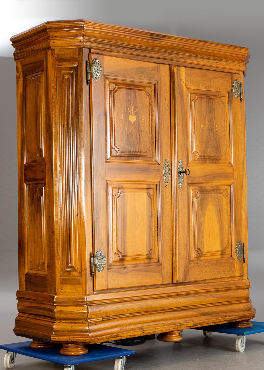 Nogal macizo/latón. La base del marco debidamente perfilada descansa sobre pies esféricos prensados. Cuerpo rectangular, dividido en tres lados por rellenos de cojines. Lisia colocó sobre las esquinas. En los paneles superiores de los frentes de las puertas hay un monograma de Cristo incrustado y el corazón traspasado de Jesús y el monograma 'AS' de un propietario. Herrajes de latón decorado. El interior sin núcleo y complementado por uso posterior. alto x ancho x profundidad: aprox. 203x180x66cm.
