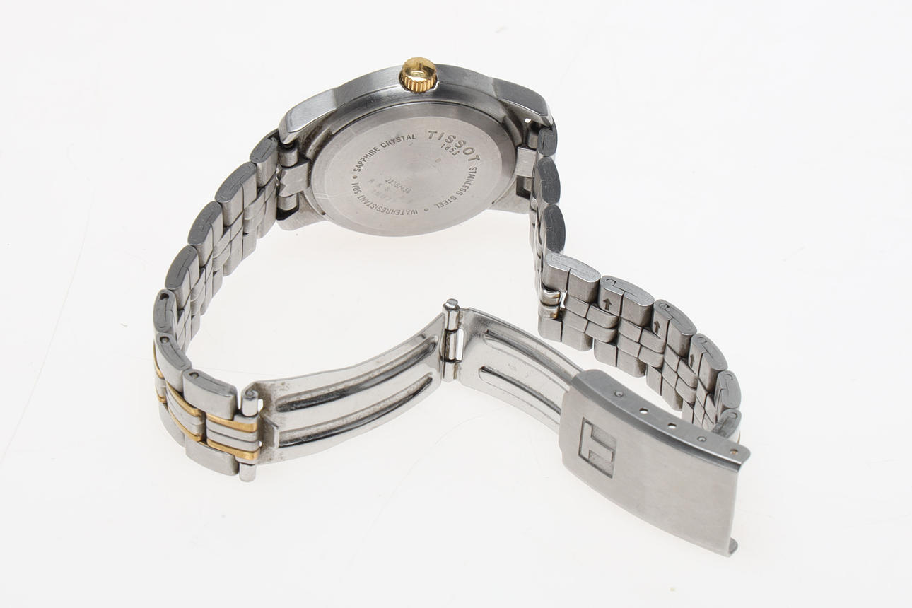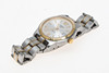 Caja y eslabón de acero parcialmente chapado en oro Esfera blanca con índices dorados, fecha, cuarzo, cristal de zafiro. Diámetro aproximado 2,8 cm.
