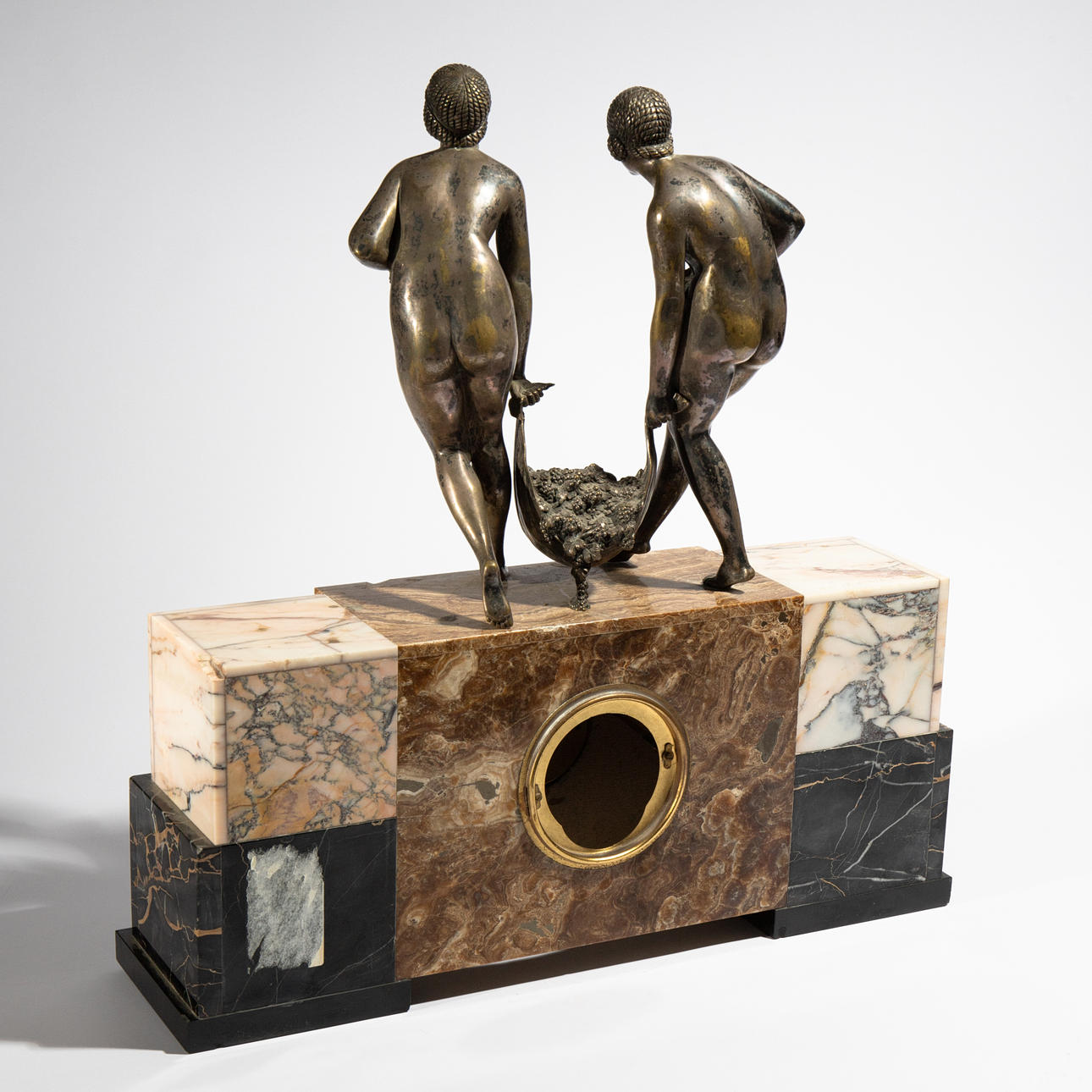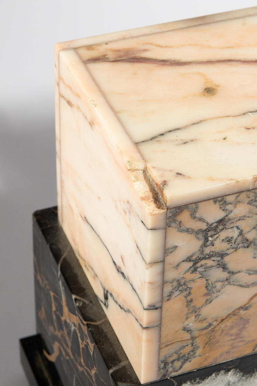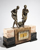 2 Chiparus esculturas de metal plateado o bronce sobre un reloj de mármol, allí firmado Chiparus. aprox. hacia 1935 --- Dimensiones: 58 x 50 x 10 cm.