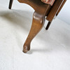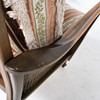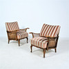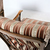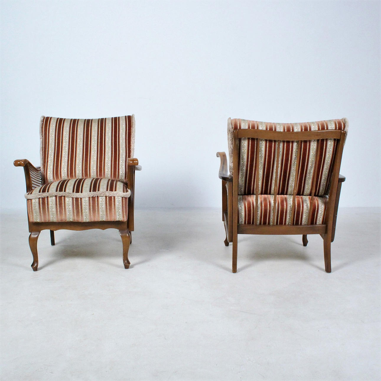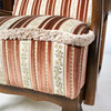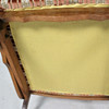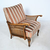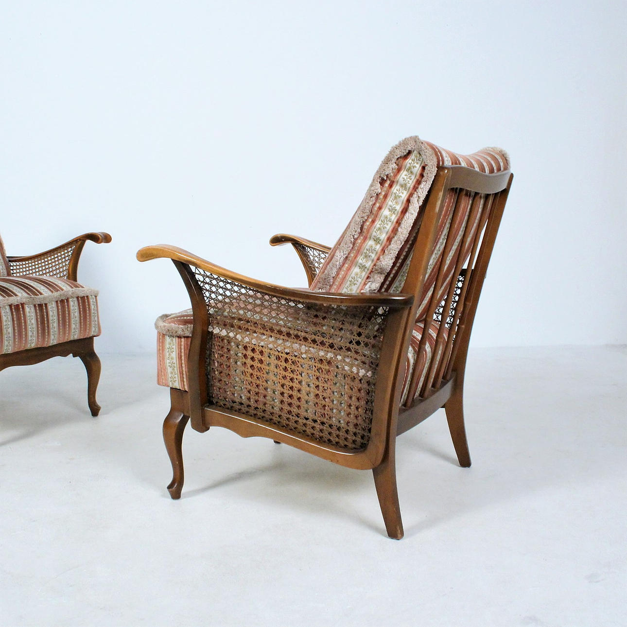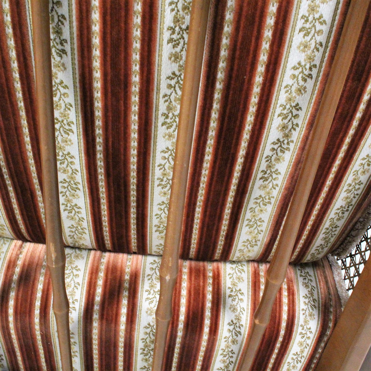 Material: madera oscura, cestería vienesa, terciopelo a rayas y flores estilo Biedermeier, pasamanería (Effile/flecos cortados) Dimensiones del sillón: Al: 82 cm, An: 68 cm, Pr: 68 cm.