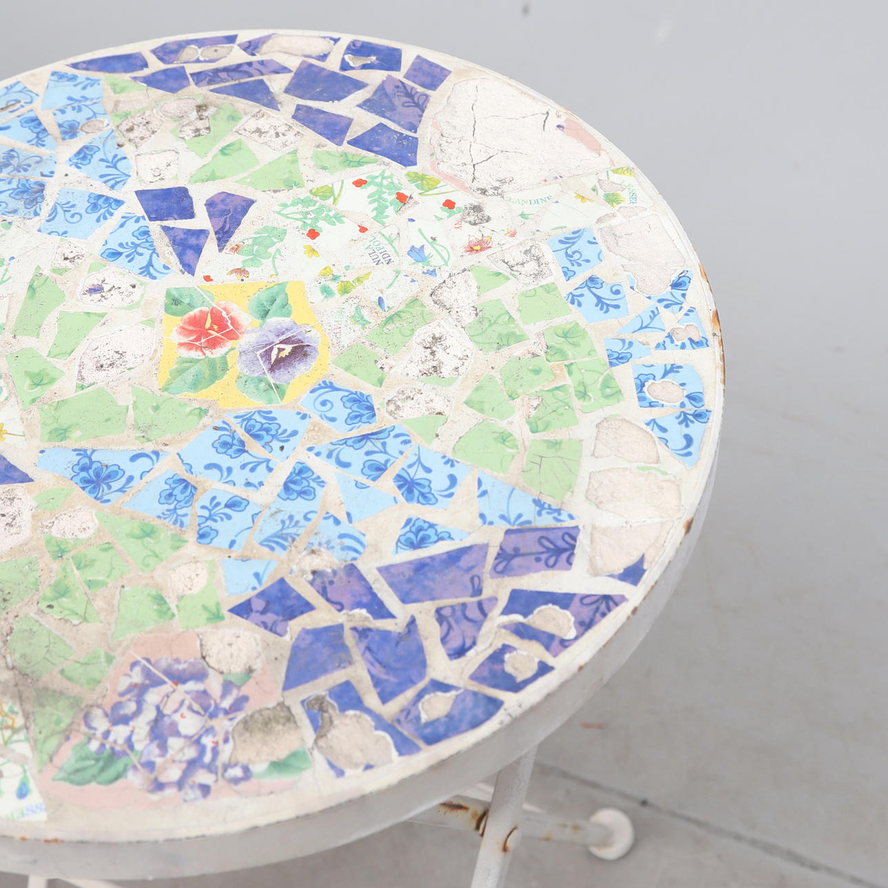 Mesa, metal y mosaico, altura aproximada 44cm, diámetro aproximado 30cm.