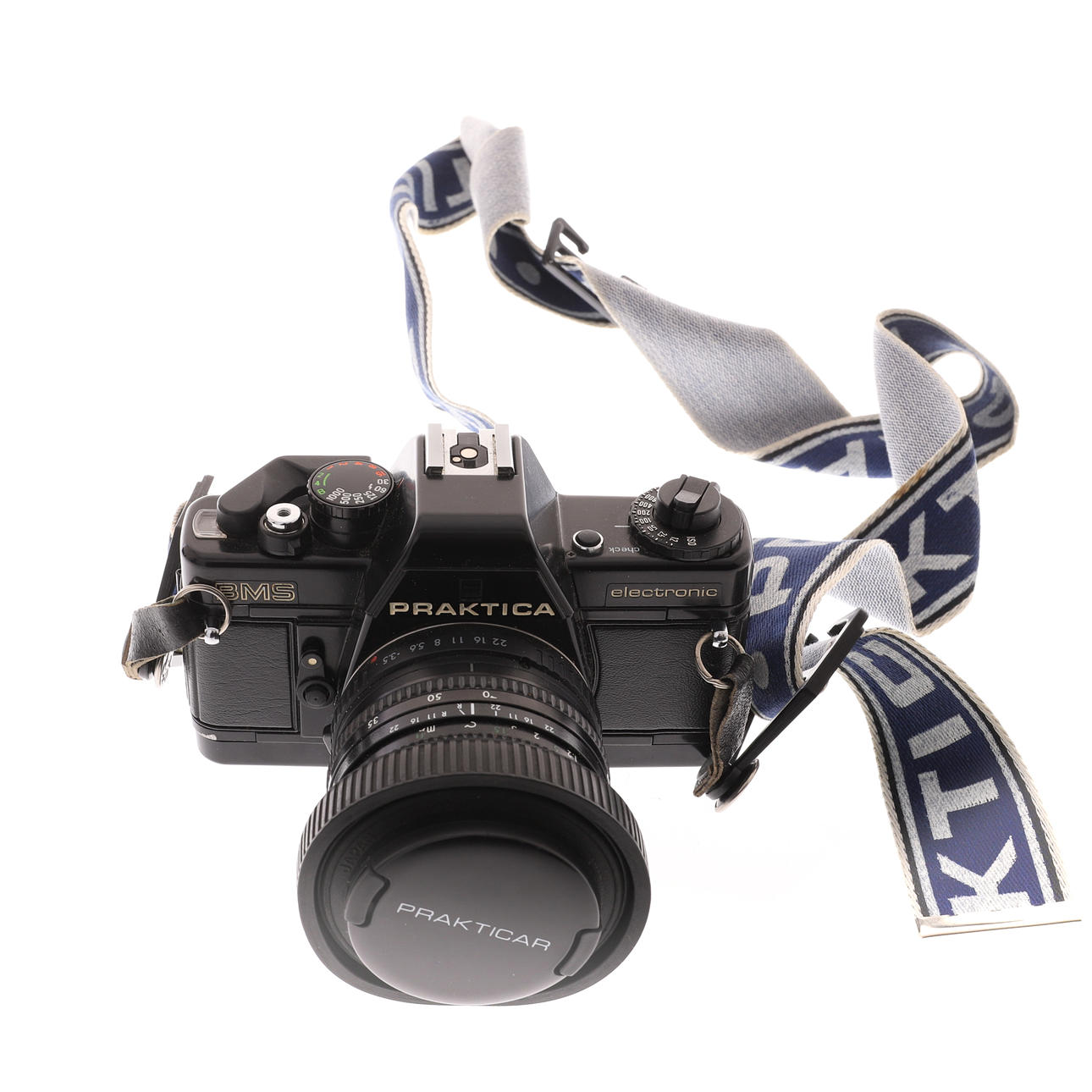 equipado con una lente de zoom Praktica f.3.5-4.5 / 35-70 mm, con correa de cámara azul y un estuche Cobra asociado, 18,5 cm de ancho, también para incluir una lente de zoom Plus-o-matic 202, 13,5 cm x 9,6 cm ( 2).