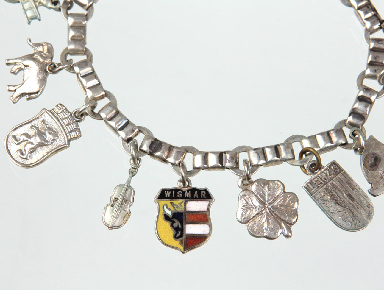 Pulsera de plata 800 con 13 colgantes diferentes de plata 800, longitud 16,5 cm, peso 18,9 gramos.