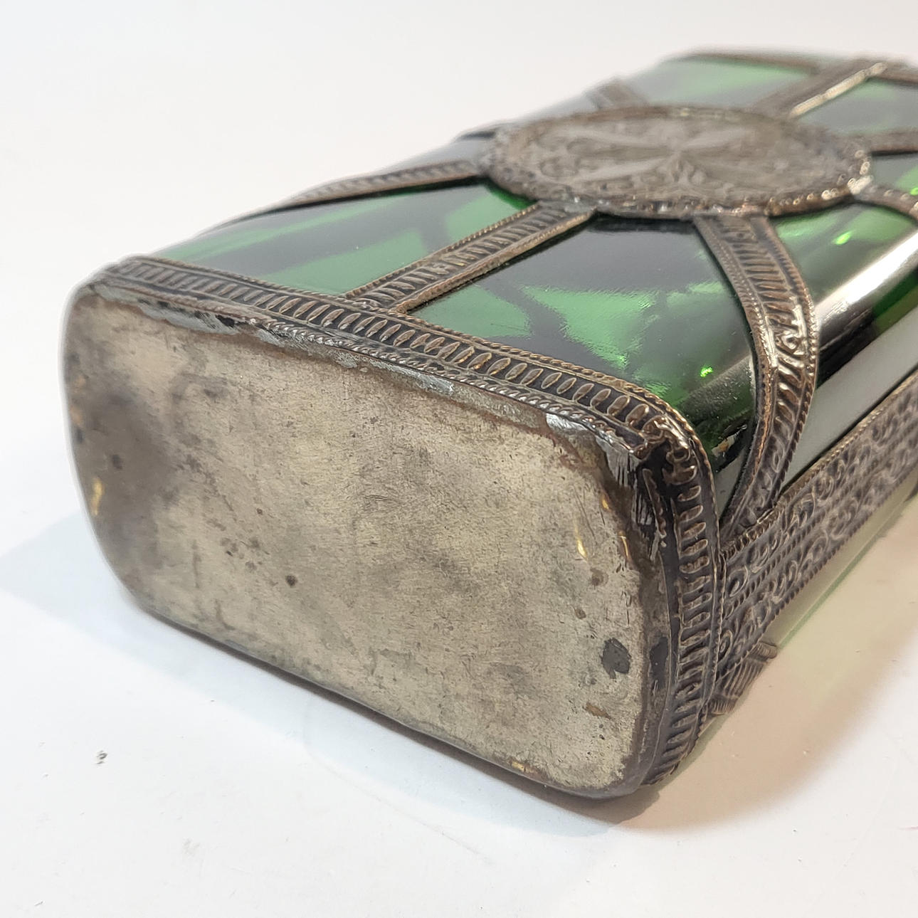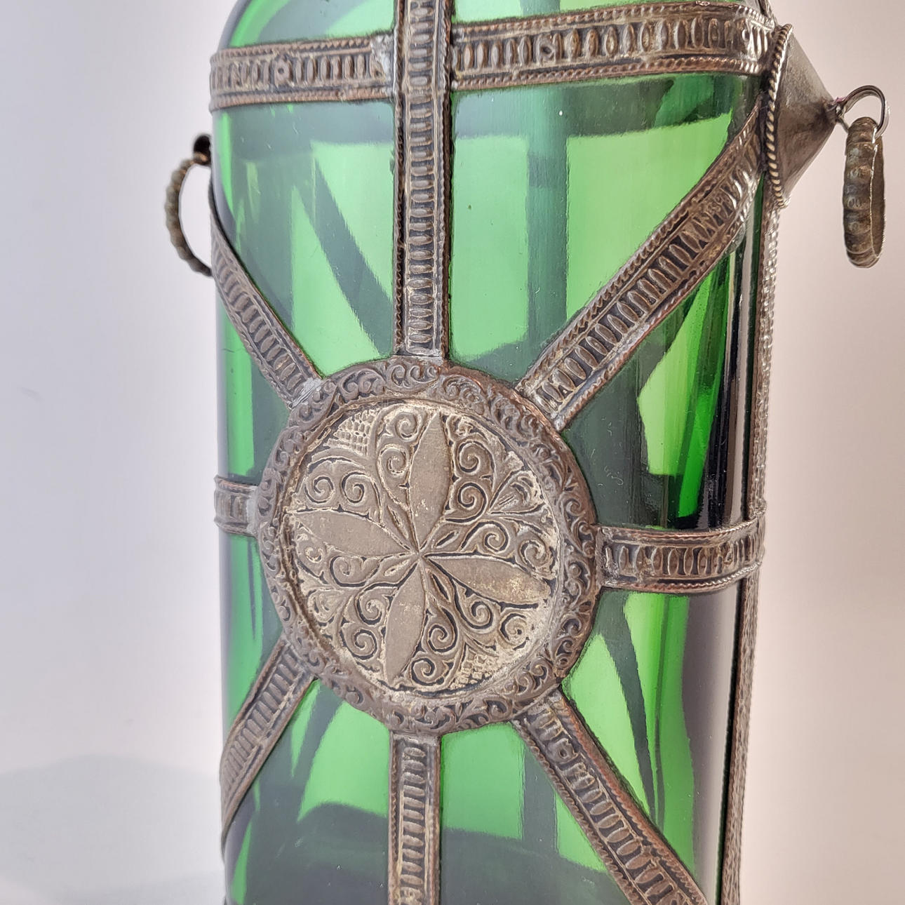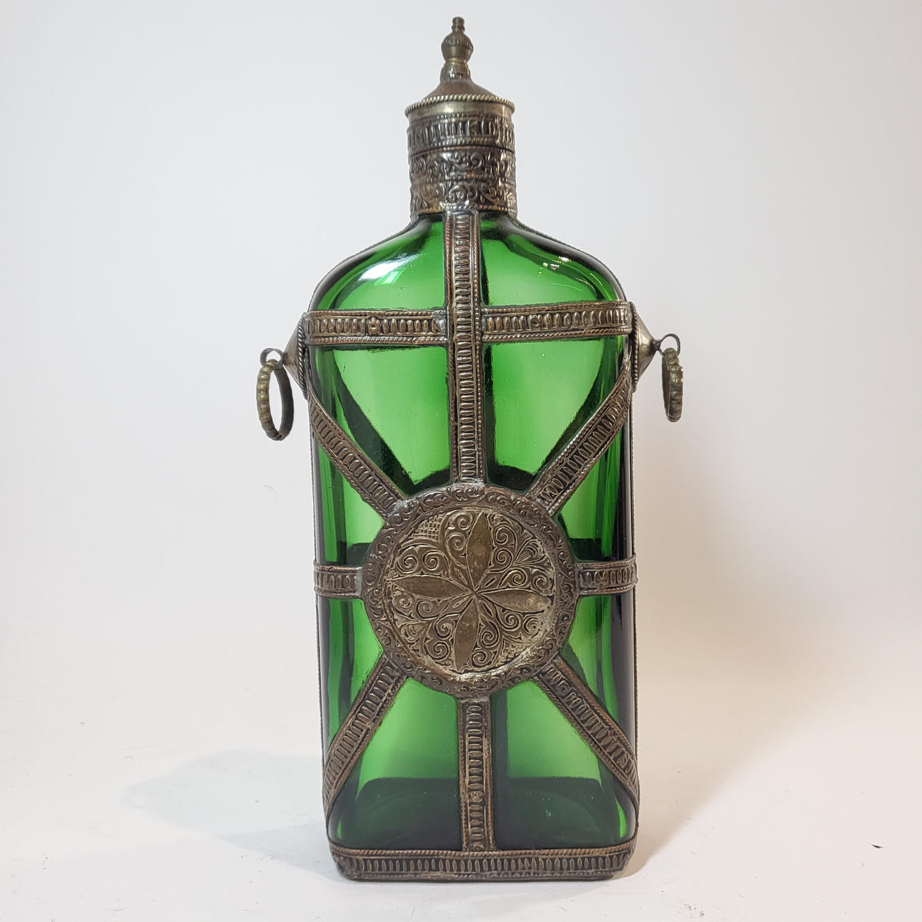 BOTELLA CANTIMPLORA ORIENTAL EN CRISTAL Y METAL.