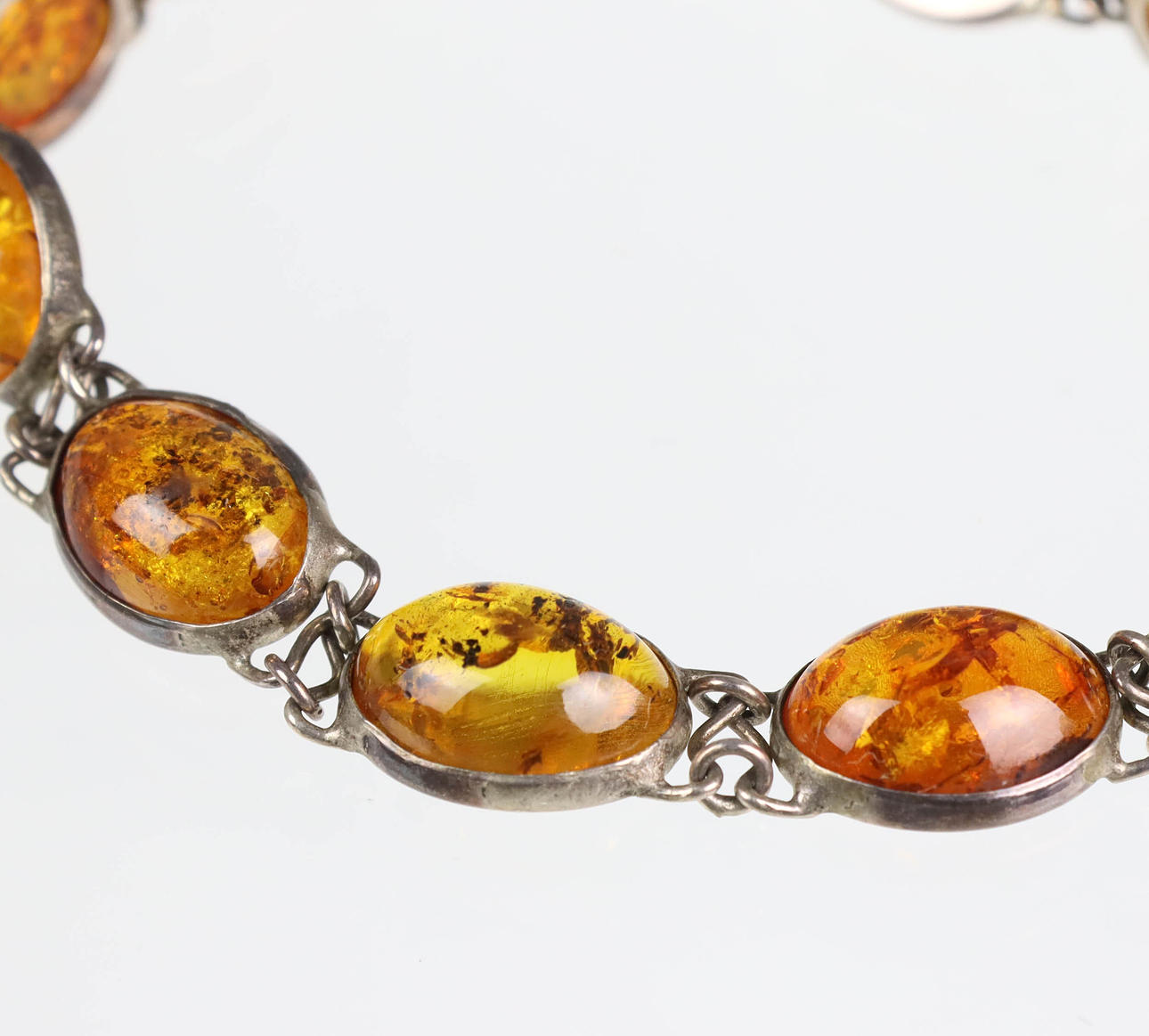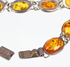 Pulsera de ámbar compuesta por diez eslabones con un cabujón de ámbar pulido en plata 925, punzonado así como el punzón de Danzig, los cabujones de ámbar ovalados tienen un tamaño de 15 x 11 mm en un marco liso, largo con cierre aprox. 20 cm peso 11,8 gramos.