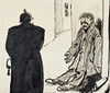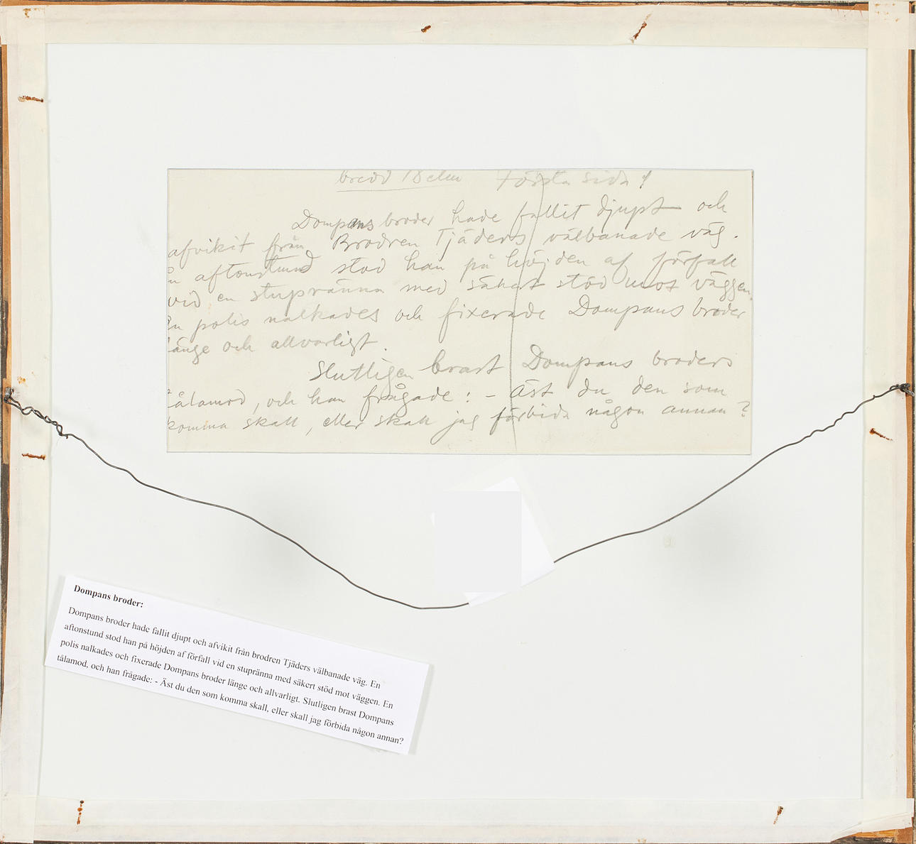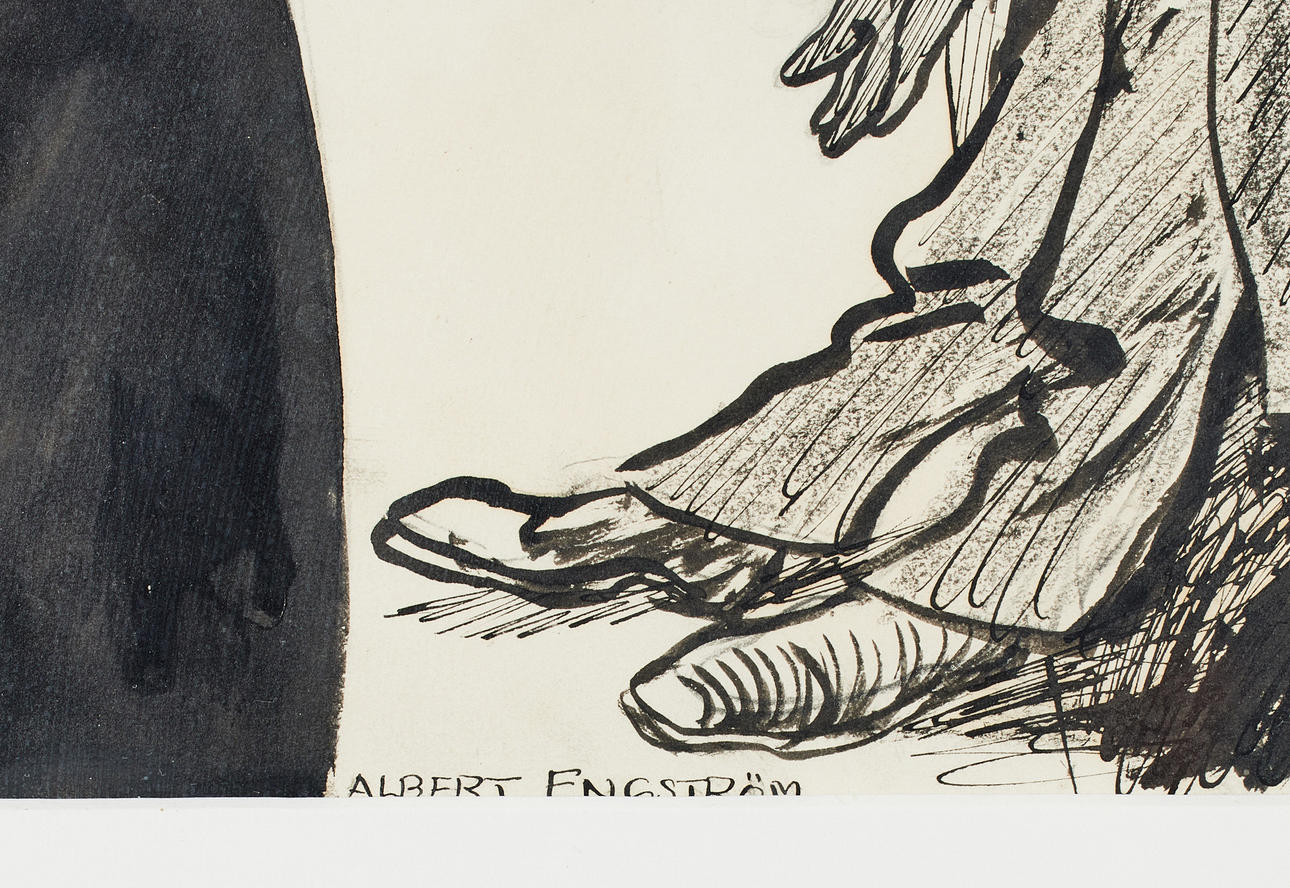 Dibujo a tinta, 21 x 25 cm. Firmado Albert Engström "El hermano de Dompan había caído profundamente y se había desviado del camino trillado del hermano Tjäder. Una noche se encontraba en el punto álgido de la decadencia junto a un tobogán con un apoyo seguro contra la pared. Un policía se acercó y fijó al hermano de Dompan durante mucho tiempo y en serio. Finalmente, la paciencia de Dompan se rompió y preguntó: - ¿Es el que ha de venir, o debo prohibir a otro?".