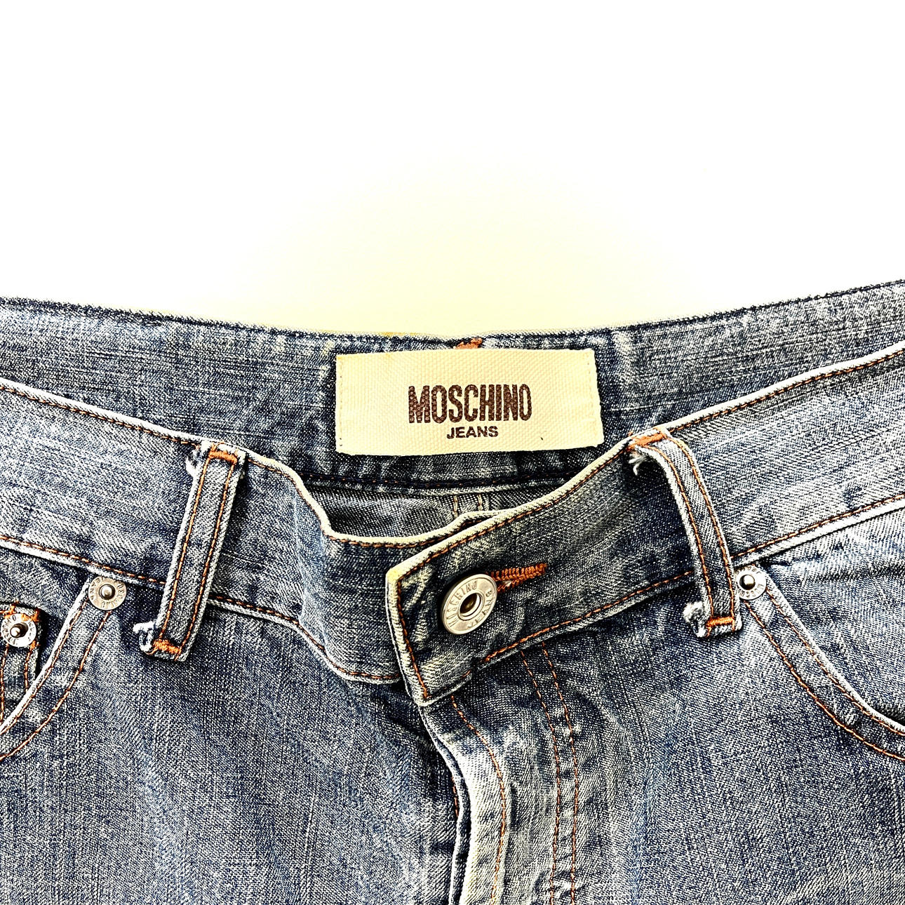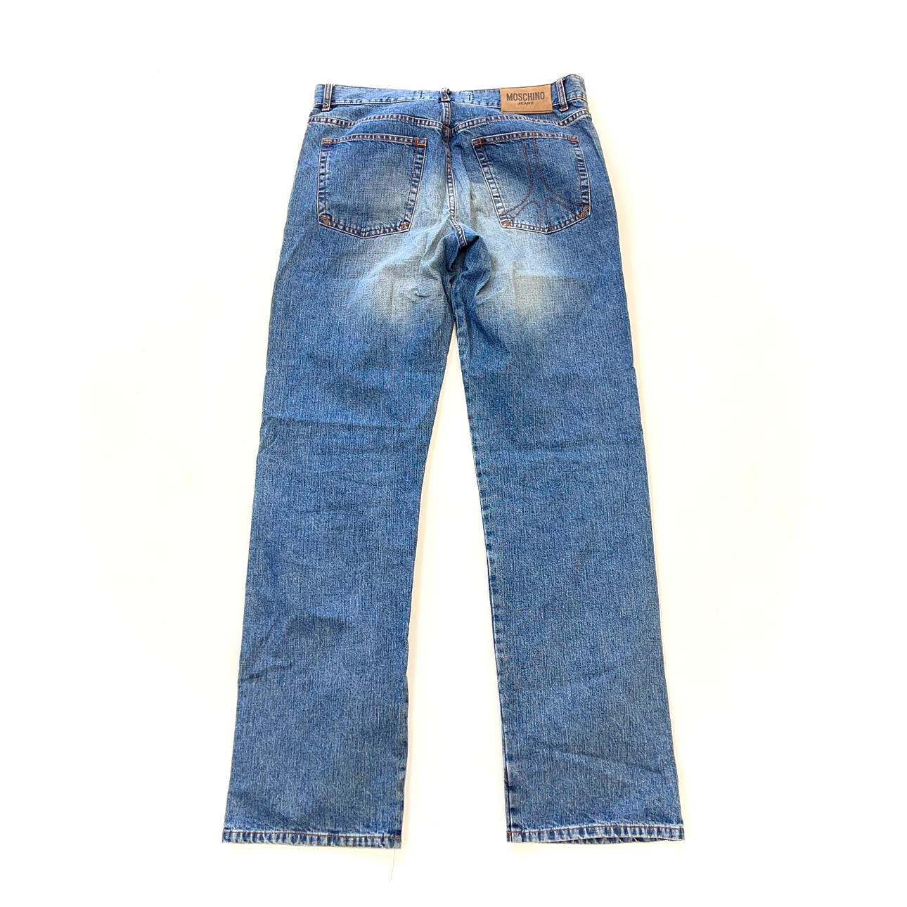 Jeans Moschino de hombre con insignias en forma de estrella y pespuntes en las piernas. Talla 33. cintura aprox. 88cm., Caderas aprox. 108cm., Largo aprox. 112 cm.