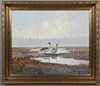 EJNAR KOHLMANN. Gansos en paisaje, óleo sobre lienzo.