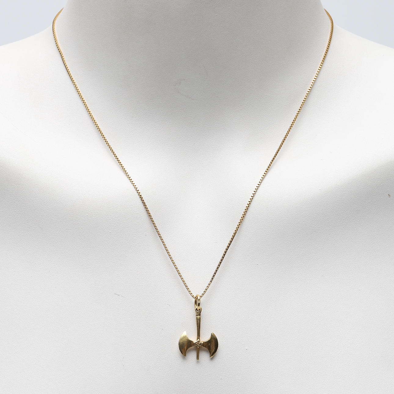 Colgante en forma de hacha de doble hoja. Longitud aproximada de 2,8 cm Cadena, longitud aproximada de 44 cm Peso aproximado de 5,6 gramos.