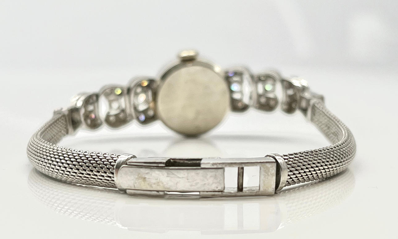 Caja en oro blanco 18m con 18mm de diámetro. Brazalete joya con diamantes y cierre clásico en malla. Movimiento cuerda manual. 1,2cts total aprox. Peso total 27,20gr.