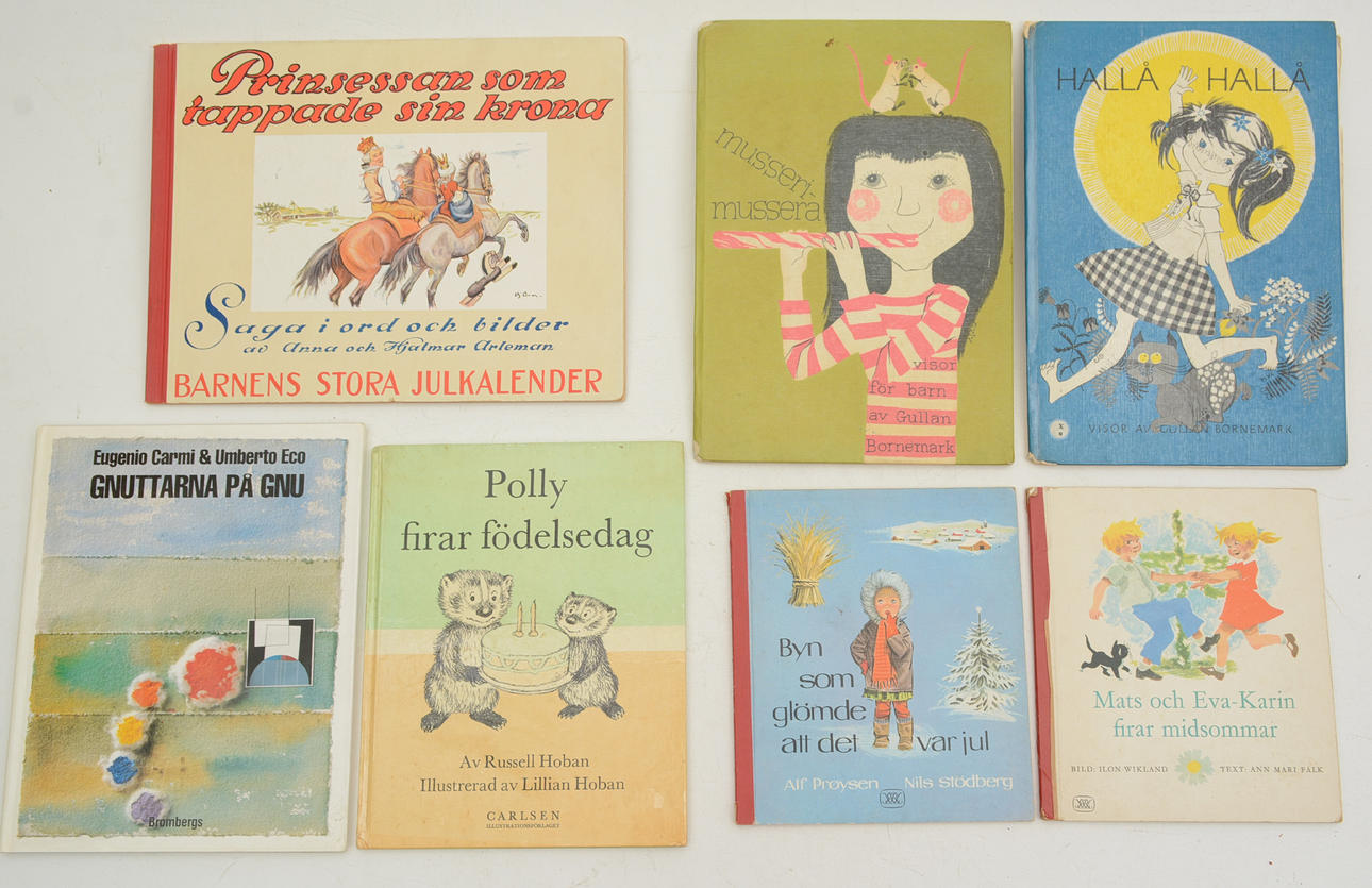 Mats y Eva-Karin celebran el solsticio de verano / Ann Mari Falk, 1962 El pueblo que lo olvidó era Navidad / Alf Prøysen, 1962 Hallå Hallå / Gullan Bornemark, Musseri-mussera / Gullan Bornemark, 1967 Polly celebra su cumpleaños / Russel Hoban, 1968 Gnuttarna på Gnu , Umberto Eco, 1992 La princesa que perdió la corona, 1927.