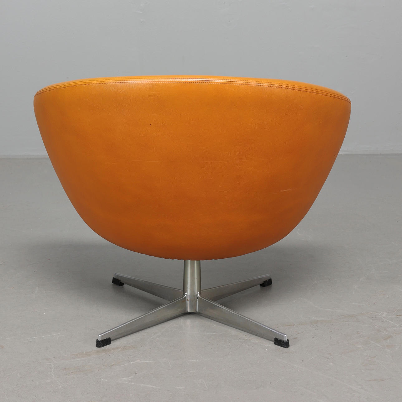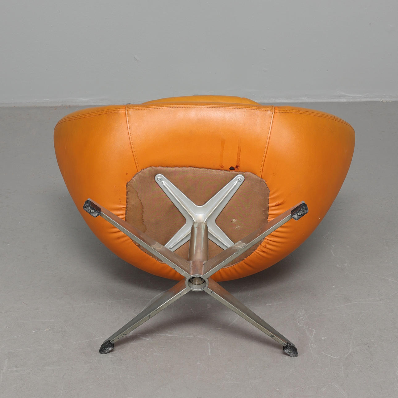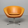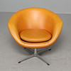 Butaca completamente tapizada sobre patas giratorias de cuatro juegos en aluminio. Tapizado en cuero artificial marrón rojizo.