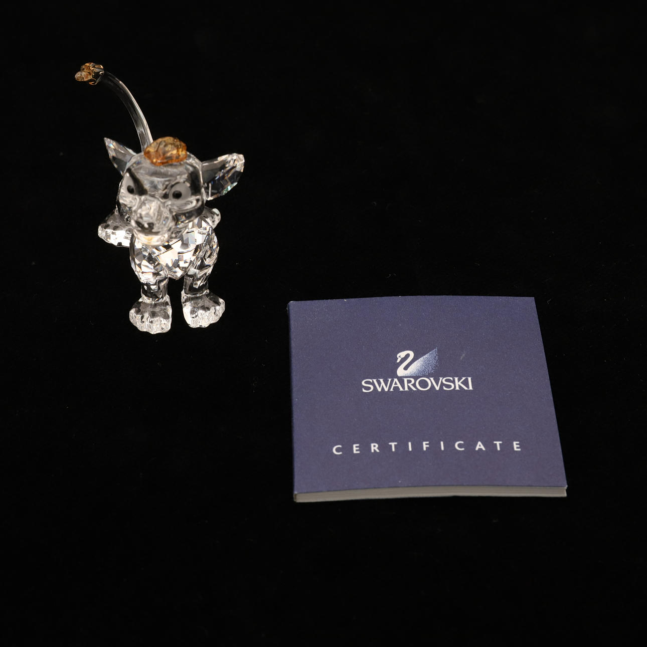 número 1048304, en cristal transparente facetado con ojos negros, la melena y la punta de la cola en cristal dorado, 4,5 cm de altura, con certificado, en caja original equipada.