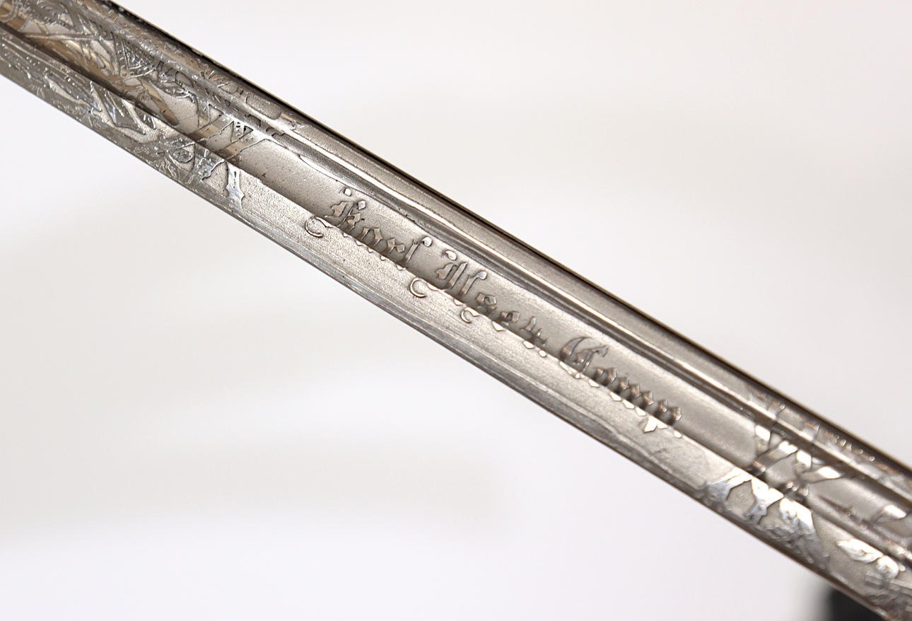 Versión con licencia, hoja niquelada y grabada de aproximadamente 52,5 cm, texto en la hoja "West Jäger Bat No 7" y "Karl Use 4 Comp", funda de cuero con herrajes de acero.