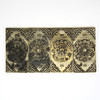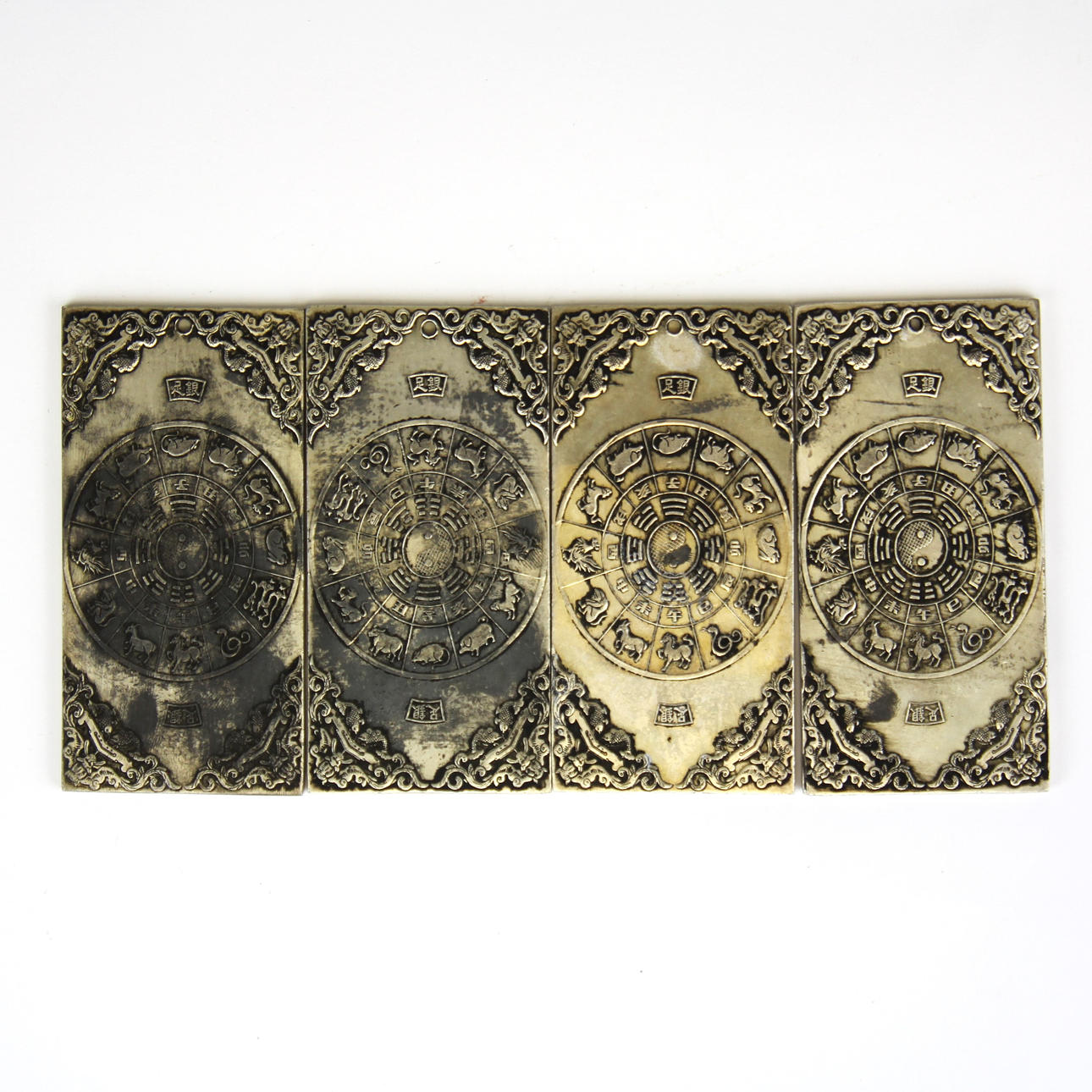 Cuatro amuletos chinos de metal blanco, 5 x 10 cm.