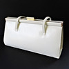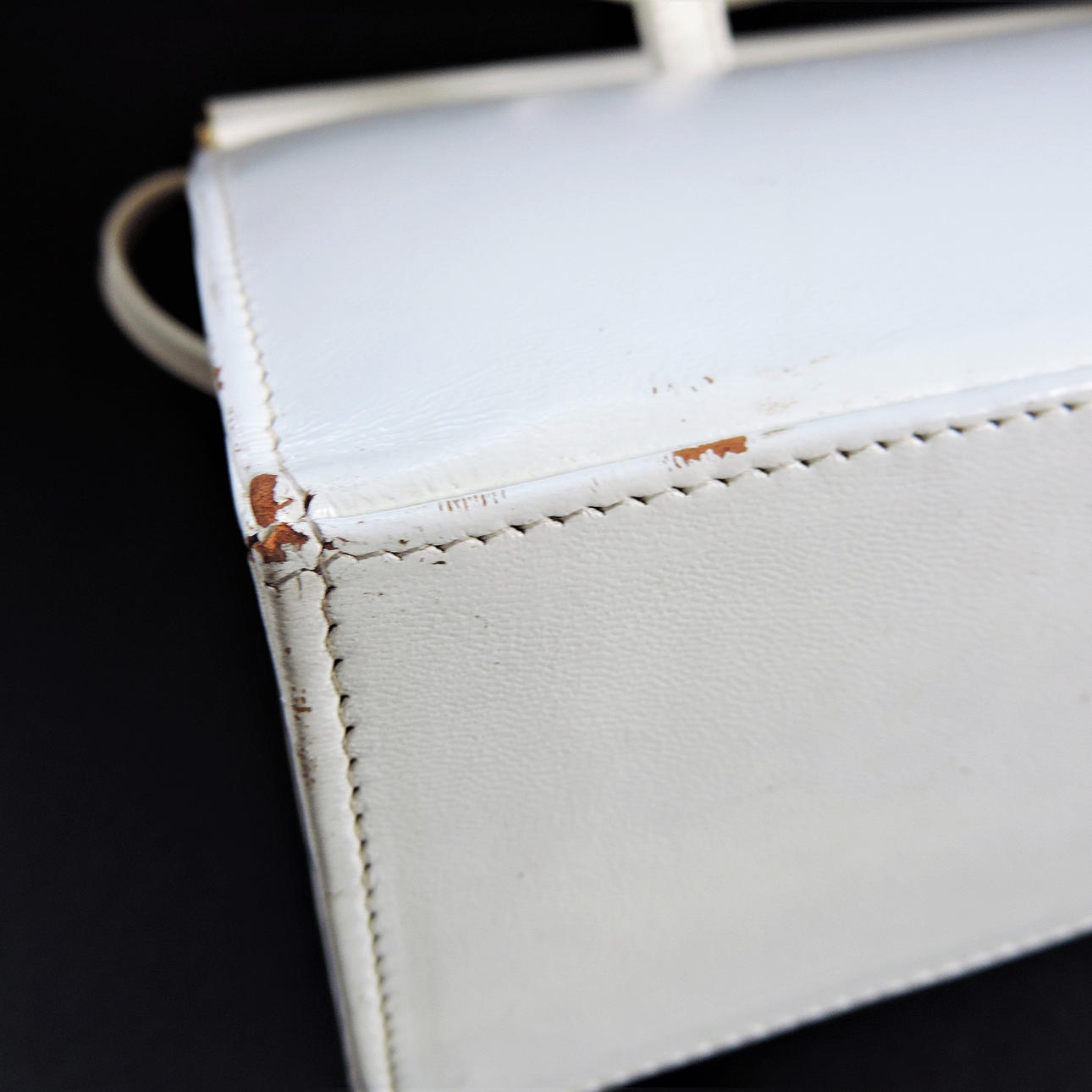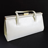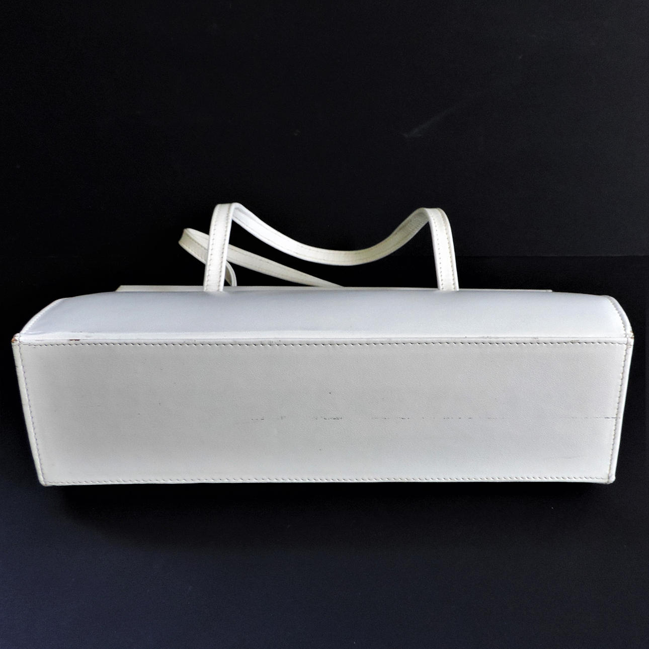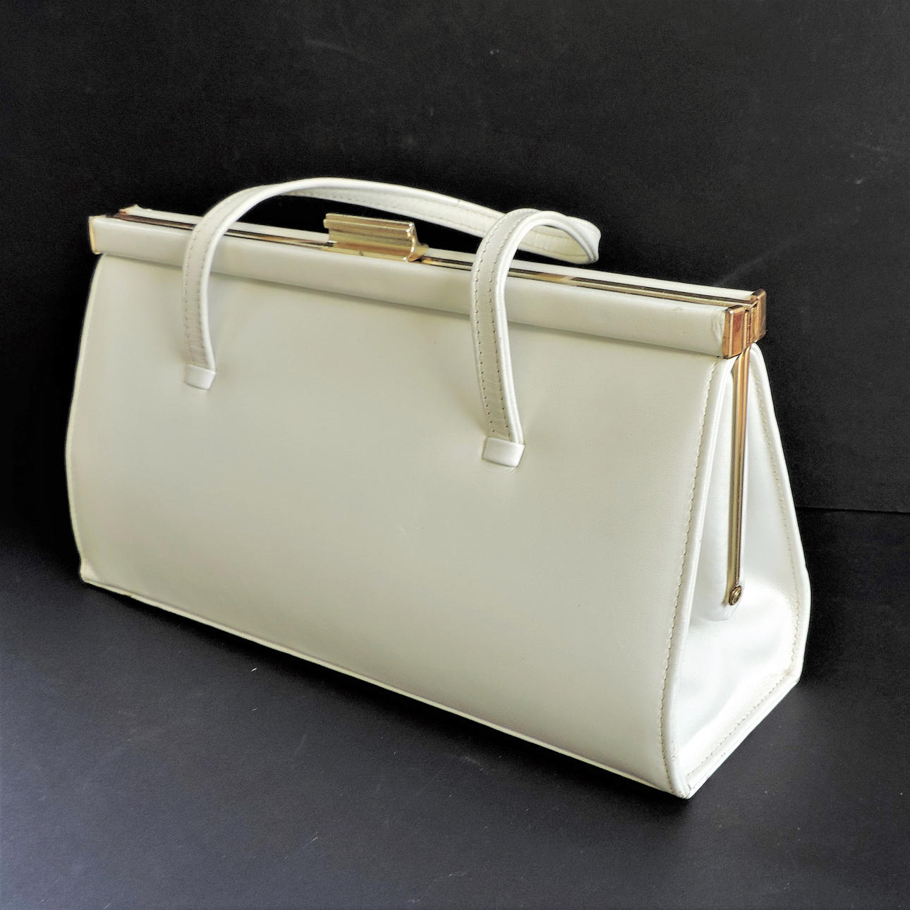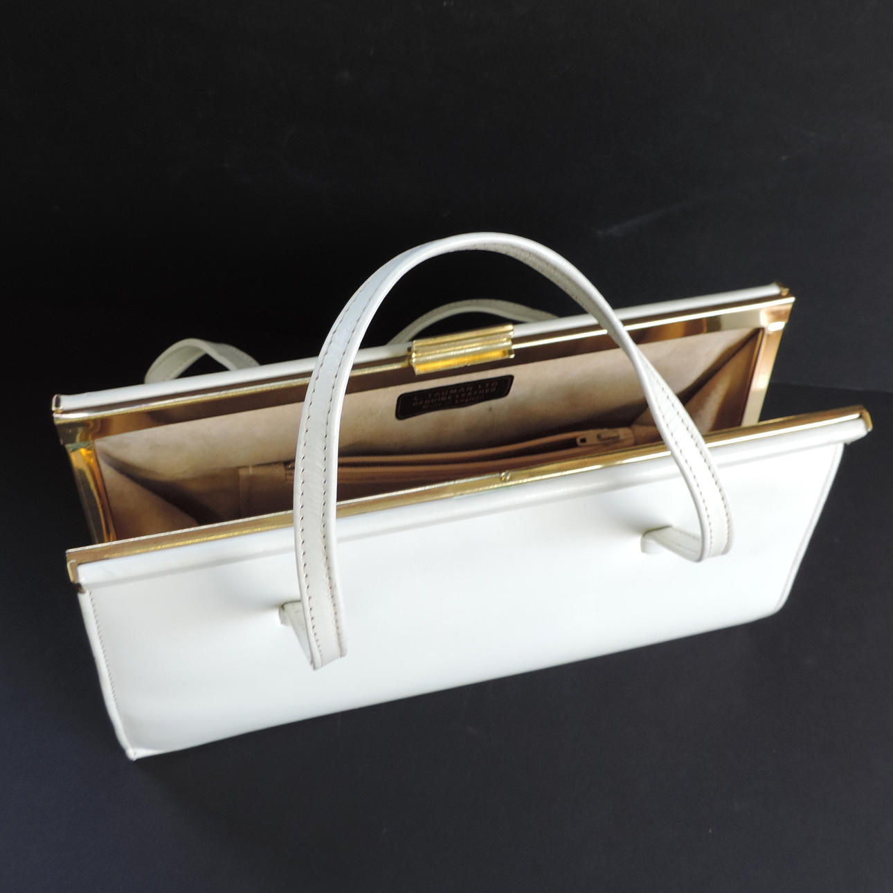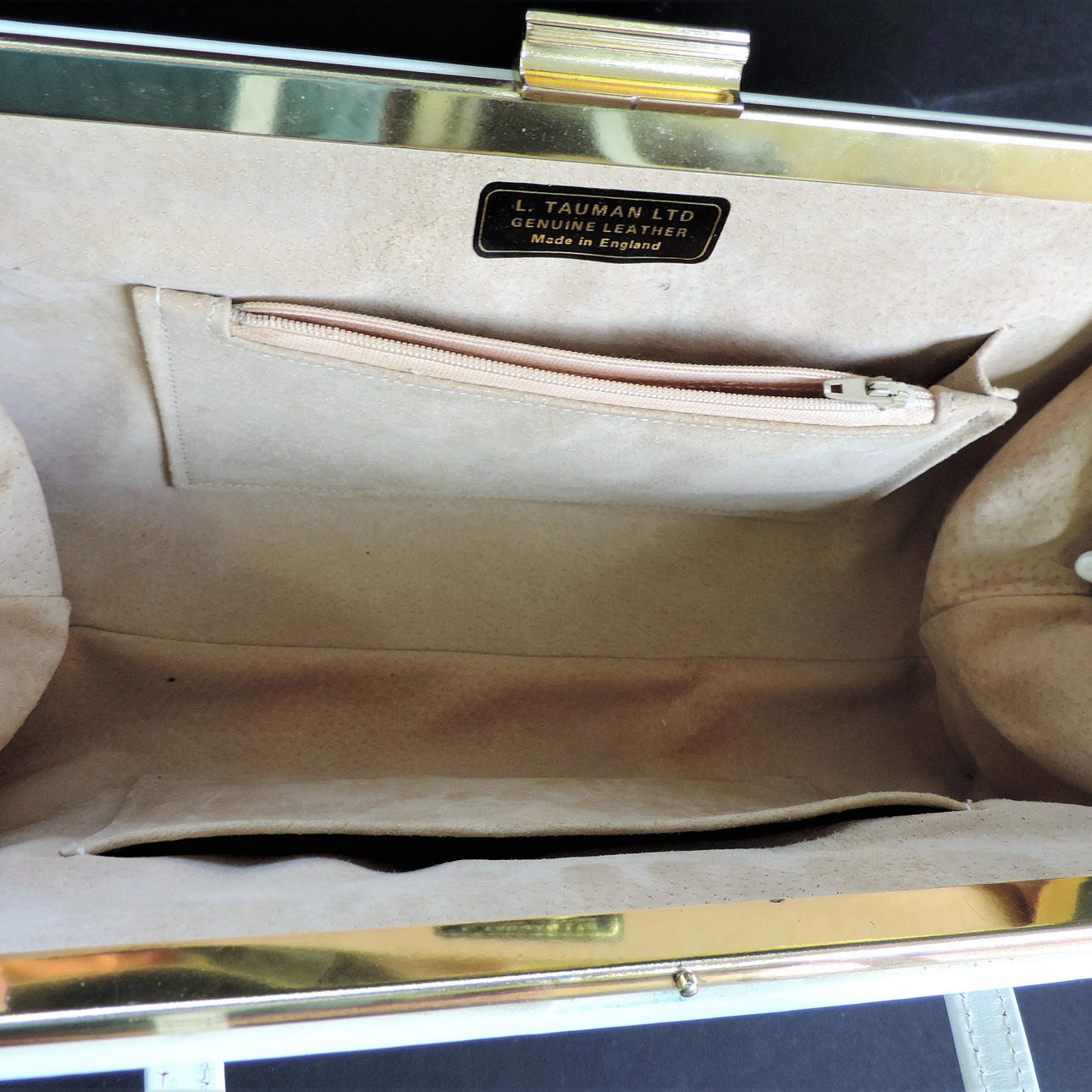 Un bolso de mano de cuero blanco de L.Tauman Ltd de los años 60 de 17 cm de alto (excluyendo las manijas) y 31 cm de ancho. Asas dobles, forro de gamuza beige con herrajes de metal dorado con 1 parche y 1 bolsillo con cremallera. Un par de rozaduras en la esquina inferior de la base.