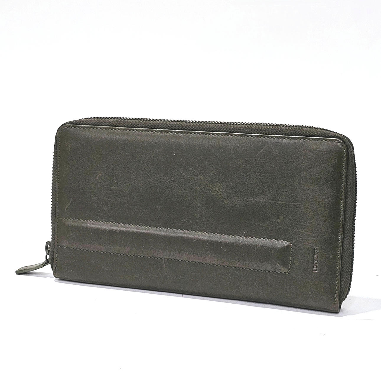En piel en tono verde oscuro. Interior con departamentos. Medidas: 24x13x3 cm. aprox. Con funda original.