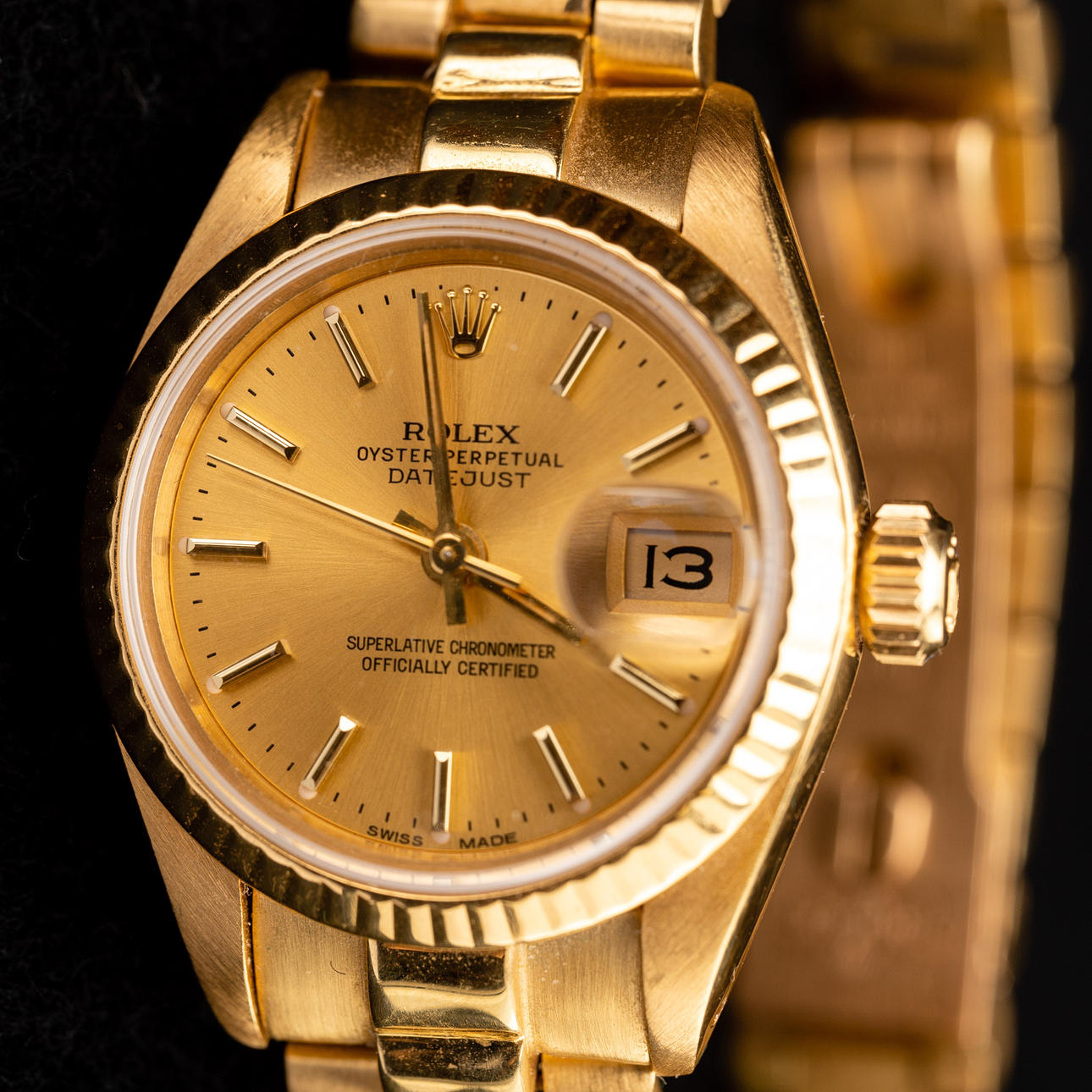RELOJ DE PULSERA PARA MUJER de mujer de Rolex, modelo 'Datejust', Ref. 69178. Caja de oro 750, esfera de oro, fecha a las 3 con función Quickset, cristal de zafiro, brazalete President de oro 750 con cierre desplegable, movimiento automático. dimensiones aprox. Carcasa Ø 26 mm, circunferencia interior aprox. 15cm El reloj estaba funcionando en el momento de la inspección, Stockhoms Auctions no garantiza la funcionalidad.