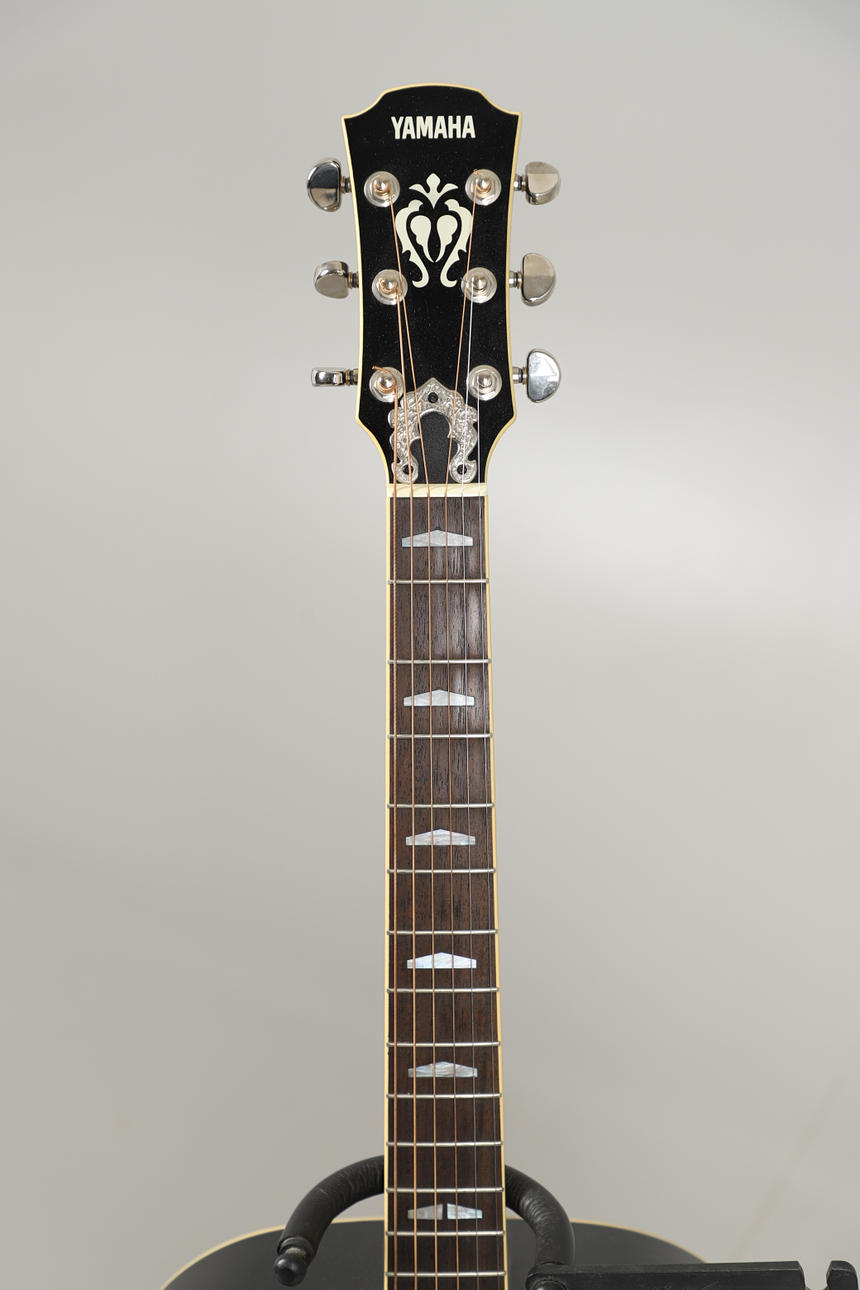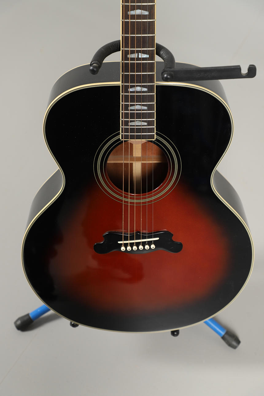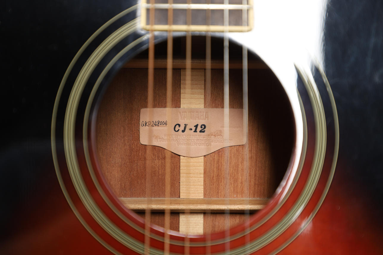 Una guitarra acústica de seis cuerdas Yamaha CJ-12, con acabado rojo burst y etiqueta interna, Número de serie QKP248004 (104 cm de altura). También con un maletín de transporte blando Kinsman. (2).