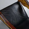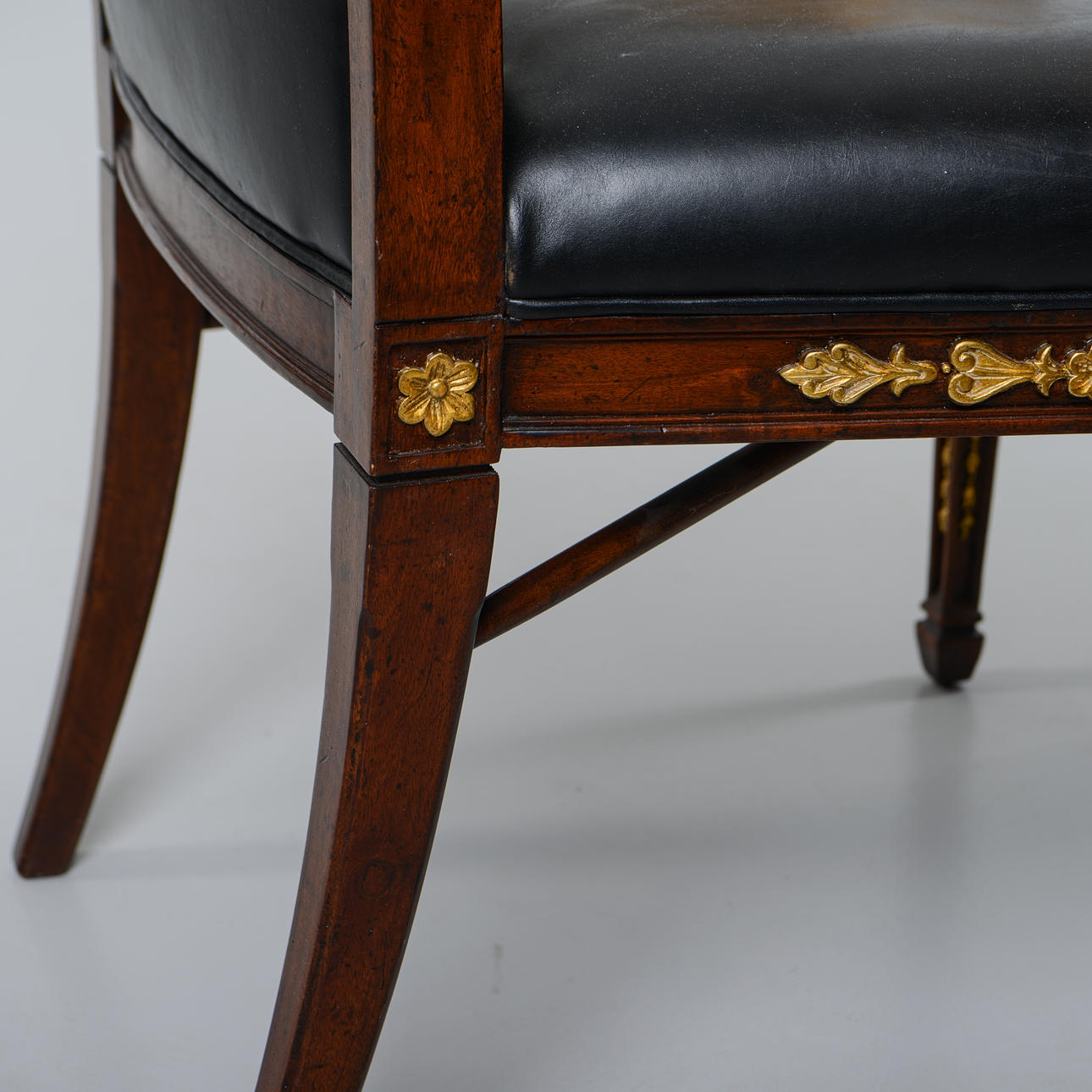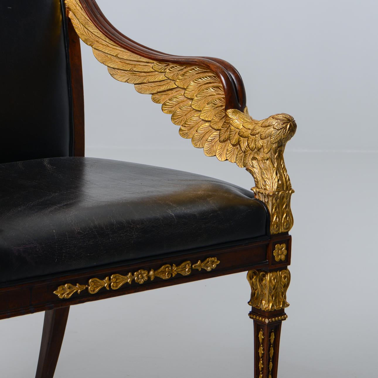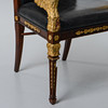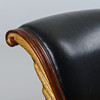 Marco de nogal, parcialmente dorado. Tapicería de cuero. Altura 95 cm. Altura del asiento 46 cm. Ancho 60 cm.