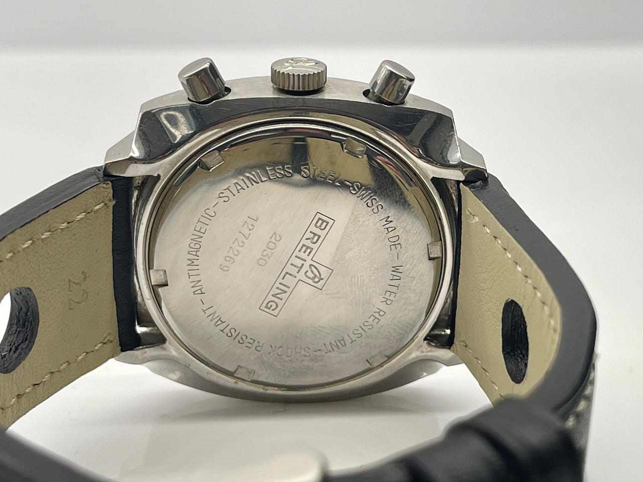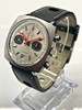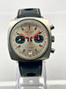 Caja de acero con 38mm de diámetro. Correa de cuero con cierre de hebilla ambos no originales. Movimiento de cuerda manual. Función chronograph. Calendario a las seis. Años 70. Ref. 2030.