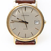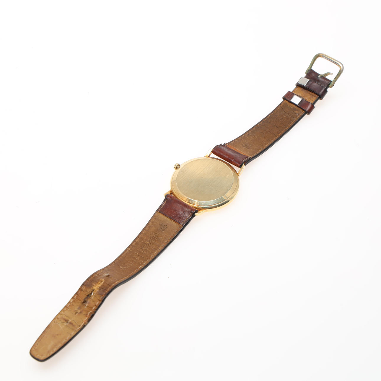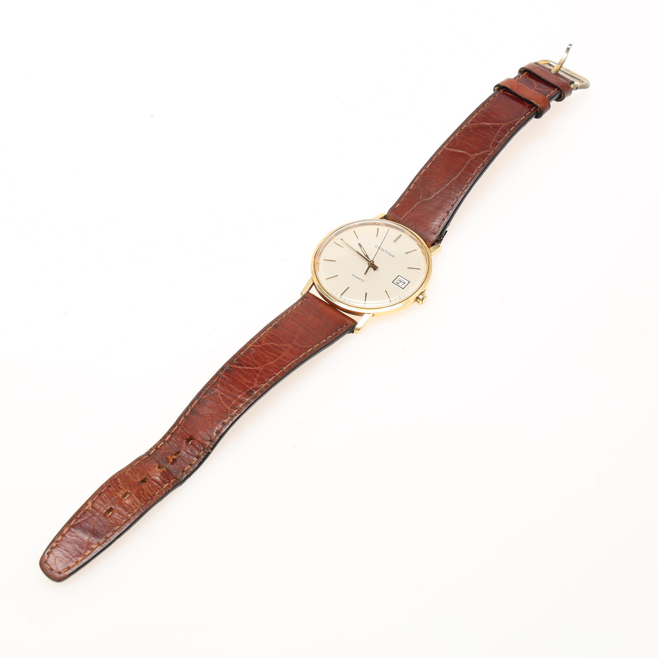 Esfera blanca con índices, segundero, fecha. Cuarzo. Correa de cuero. diámetro unos 34 mm.