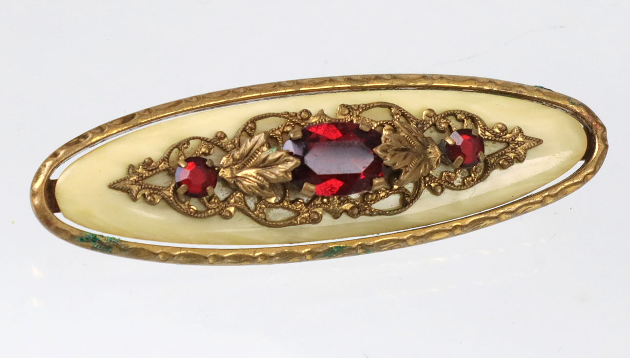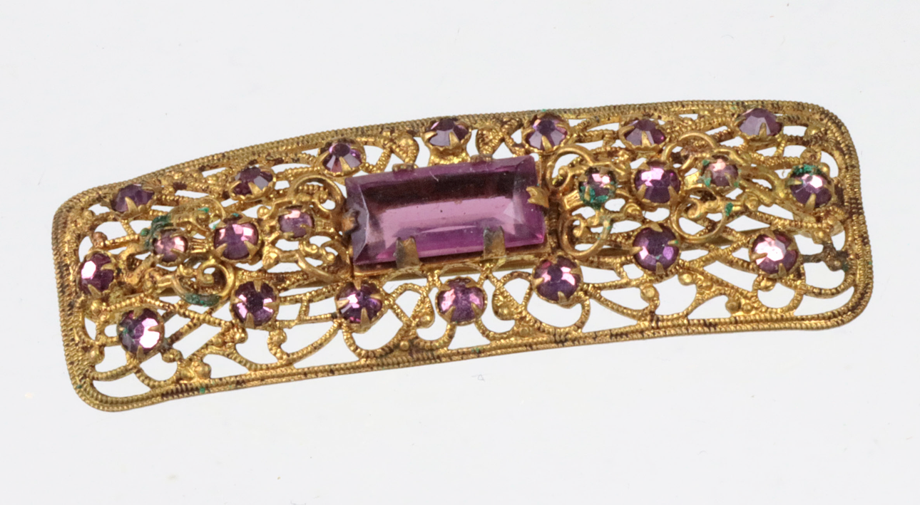 2 broches antiguos de los años 30, engastados con piedras de cristal de colores, tamaño 6 cm.