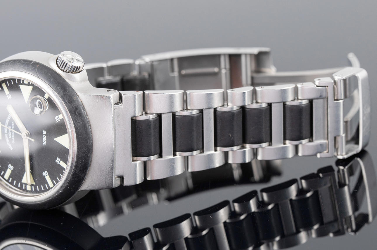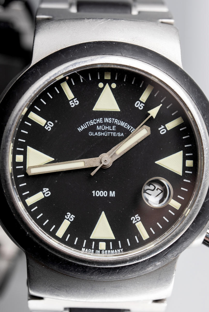 RELOJ DE PULSERA Mühle Glashütte, modelo ''Rescue Timer'', fabricado en acero/caucho. esfera negra con indicador de fecha a las '4', corona con logotipo, movimiento automático, dimensiones de la caja Ø aprox. 42 mm El reloj estaba funcionando en el momento de la inspección, Auctionet.com no garantiza la funcionalidad.