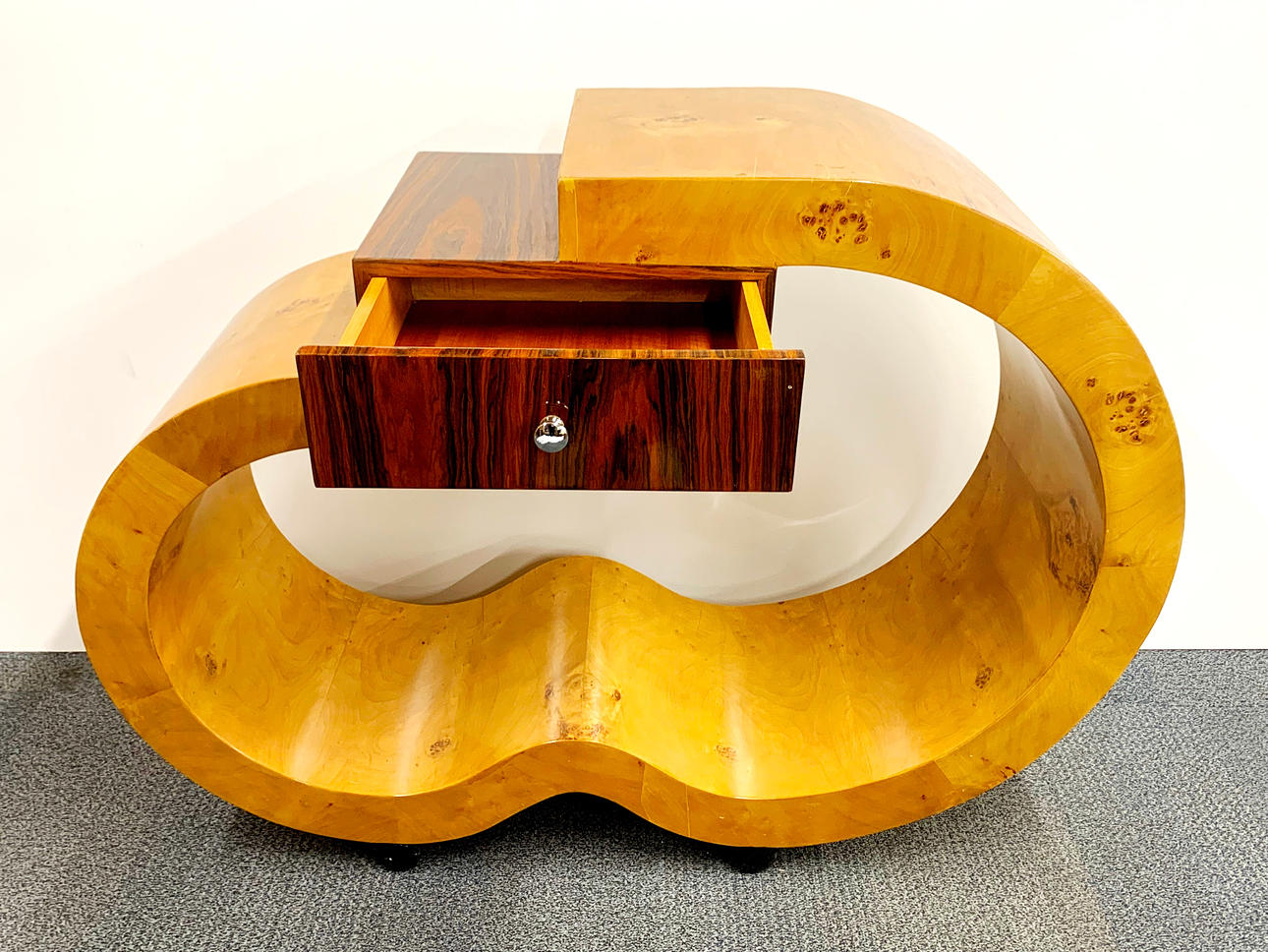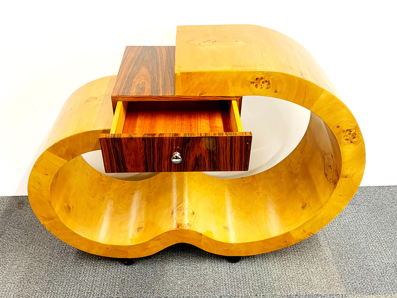 Una mesa auxiliar de estilo Art Déco inusual, chapada en nogal, L. 120 cm. Alt. 90cm.