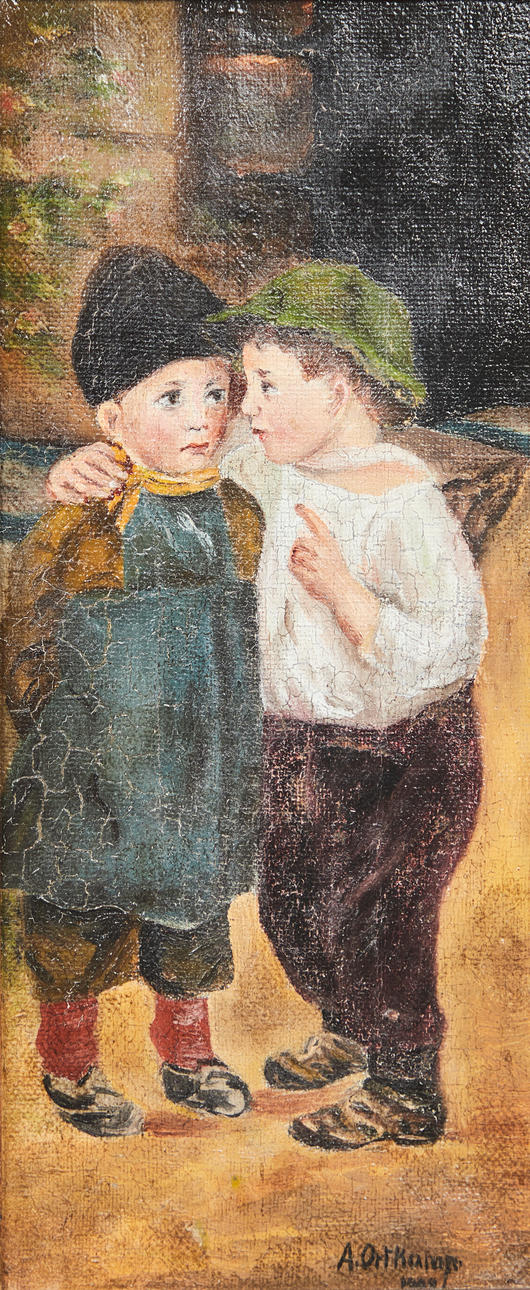 A. Ortkamp, pintura, niños jugando, óleo sobre lienzo. Par de representaciones de niños jugando o escabulléndose, cada una firmada abajo a la derecha, cada una: 29,5x12 cm (33x16 cm). (2).