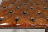 Un asiento de biblioteca de cuero marrón abotonado, con patas galvanizadas de caoba y ruedas de latón. Alto 64cm x Largo 148cm x Fondo 73cm.