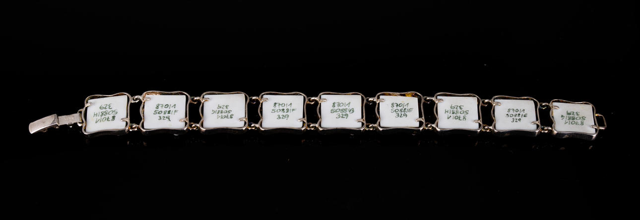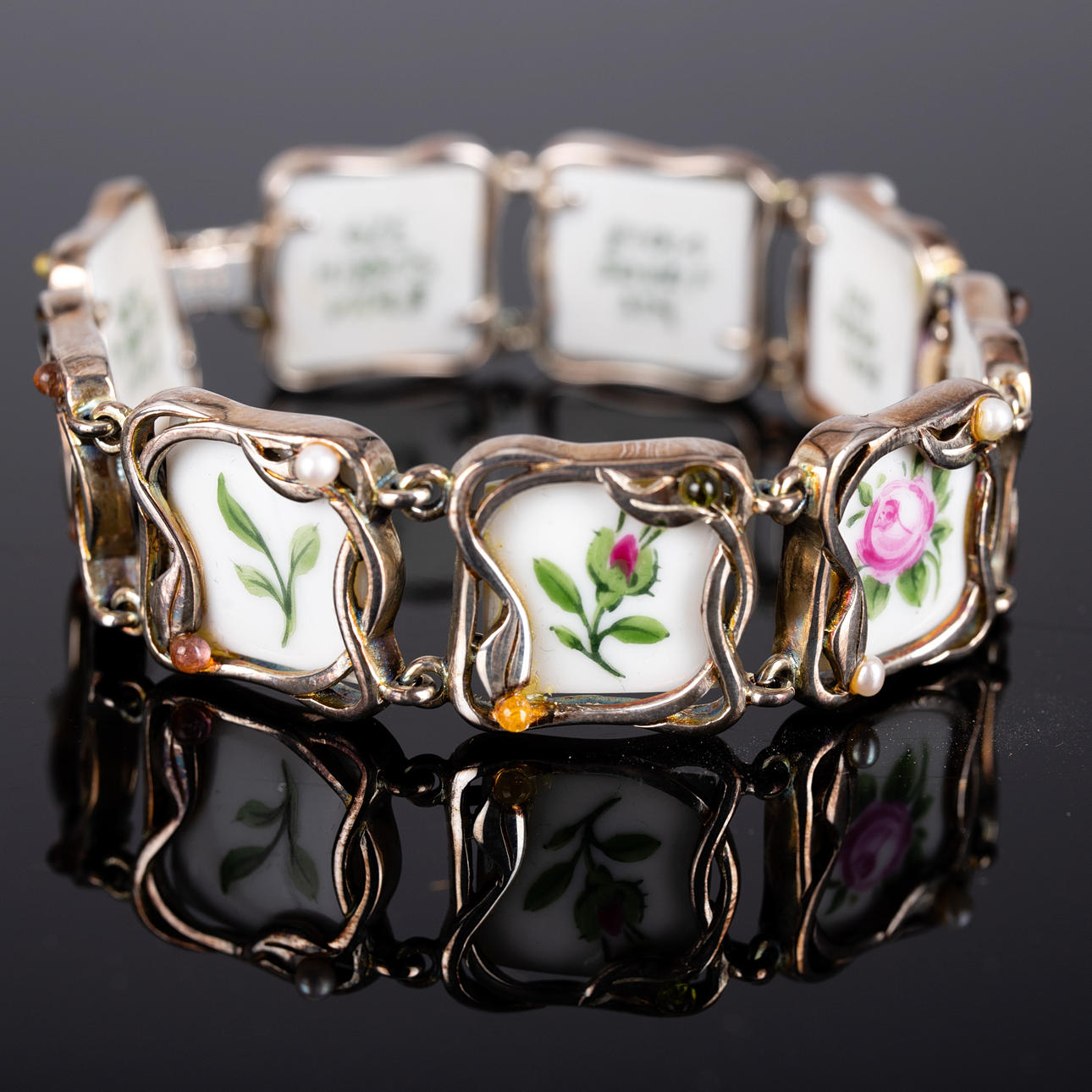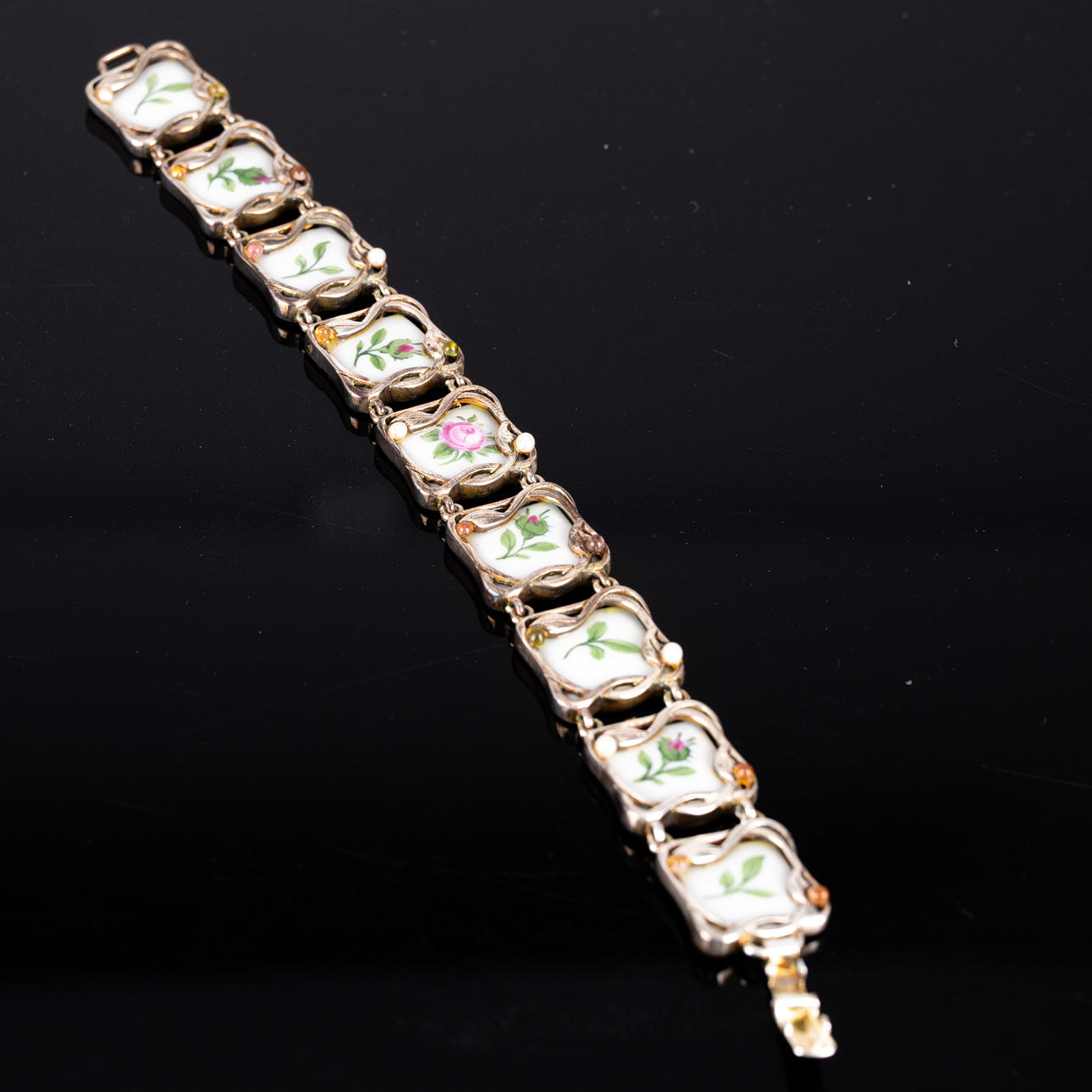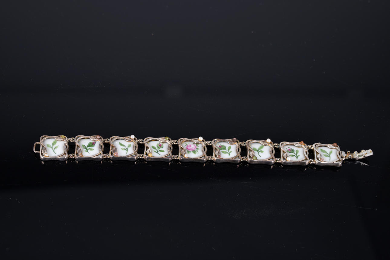 Plata 925/porcelana blanca con pintura de colores. Platos rectangulares de porcelana en engaste calado, engastados con pequeñas perlas de río y cabujones de vidrio de varios colores. . largo: aprox. 21 cm. Punzón de plata.