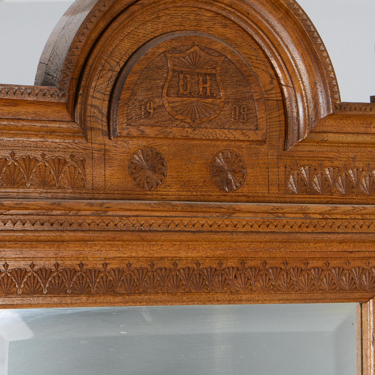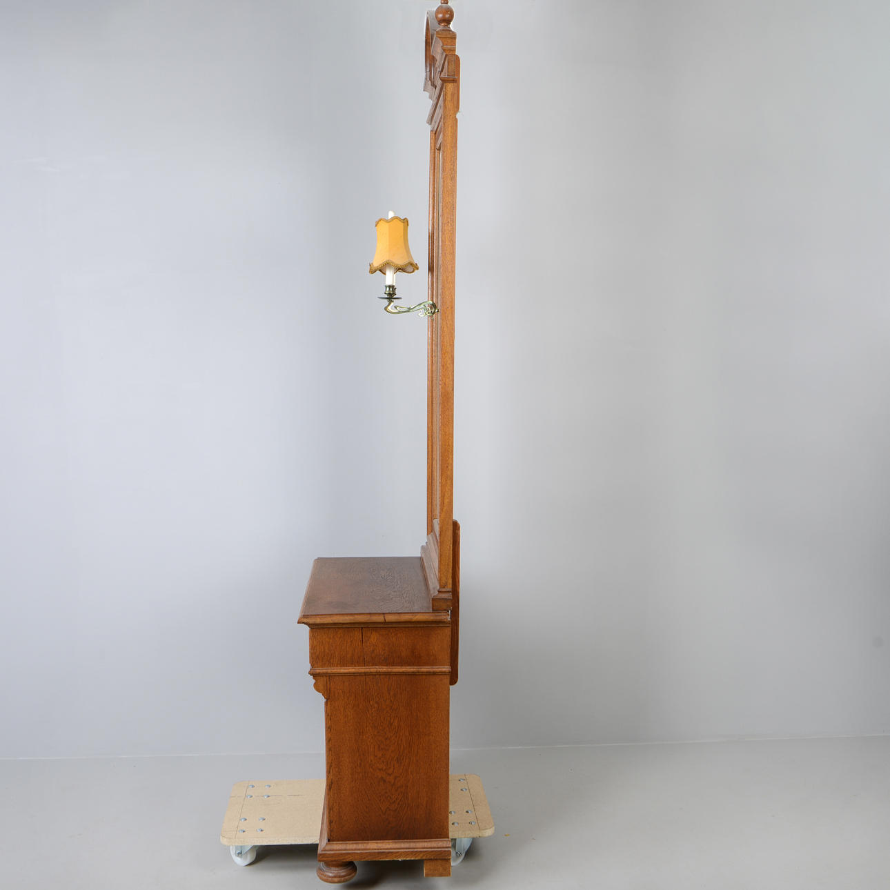 Mueble recibidor en dos partes; espejo y Còmoda. Roble. Decoración tallada. Ancho 72 cm. Profundidad 43 cm. Altura 240 cm.