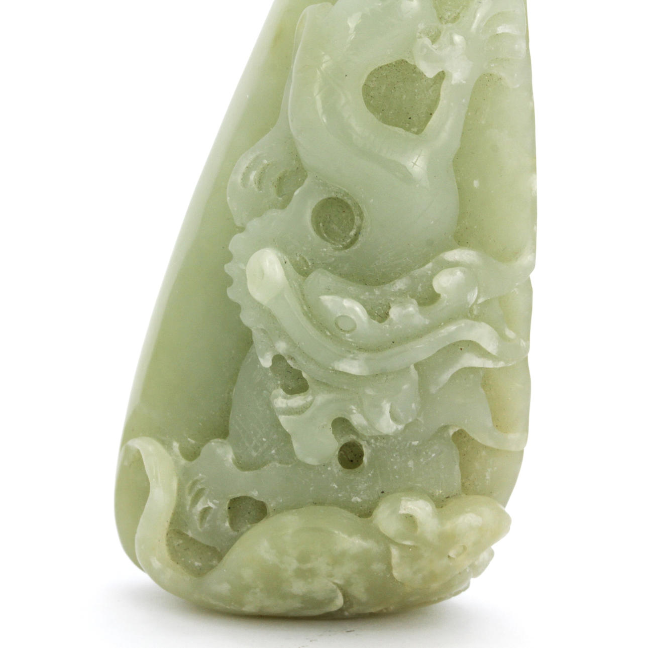 Un guijarro de jade celadón pálido chino tallado de un dragón con una rata, L. 8 cm.