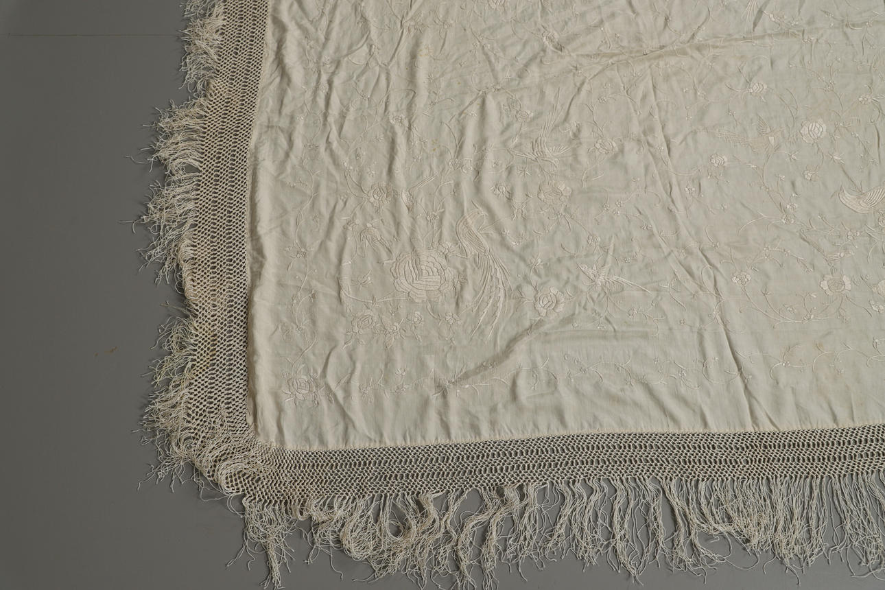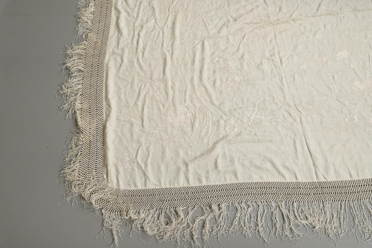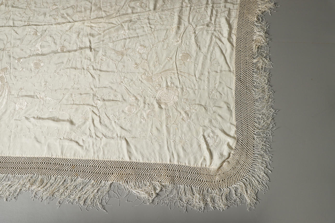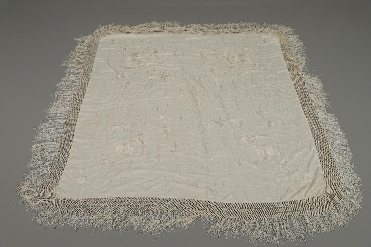 Un chal vintage de seda color crema, bordado con una variedad de pájaros y flores y con un fleco a cada lado. Panel central 121cms por 126cms.