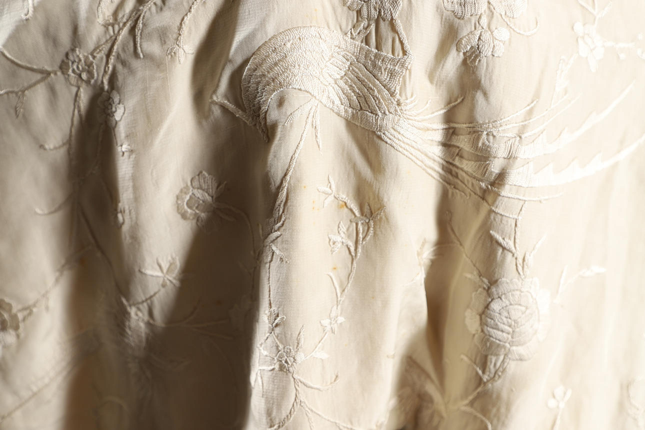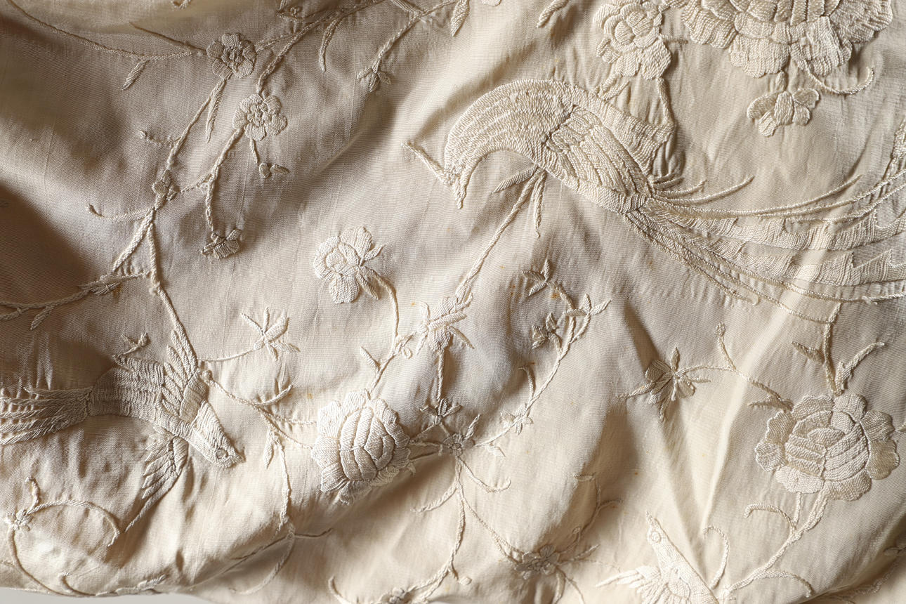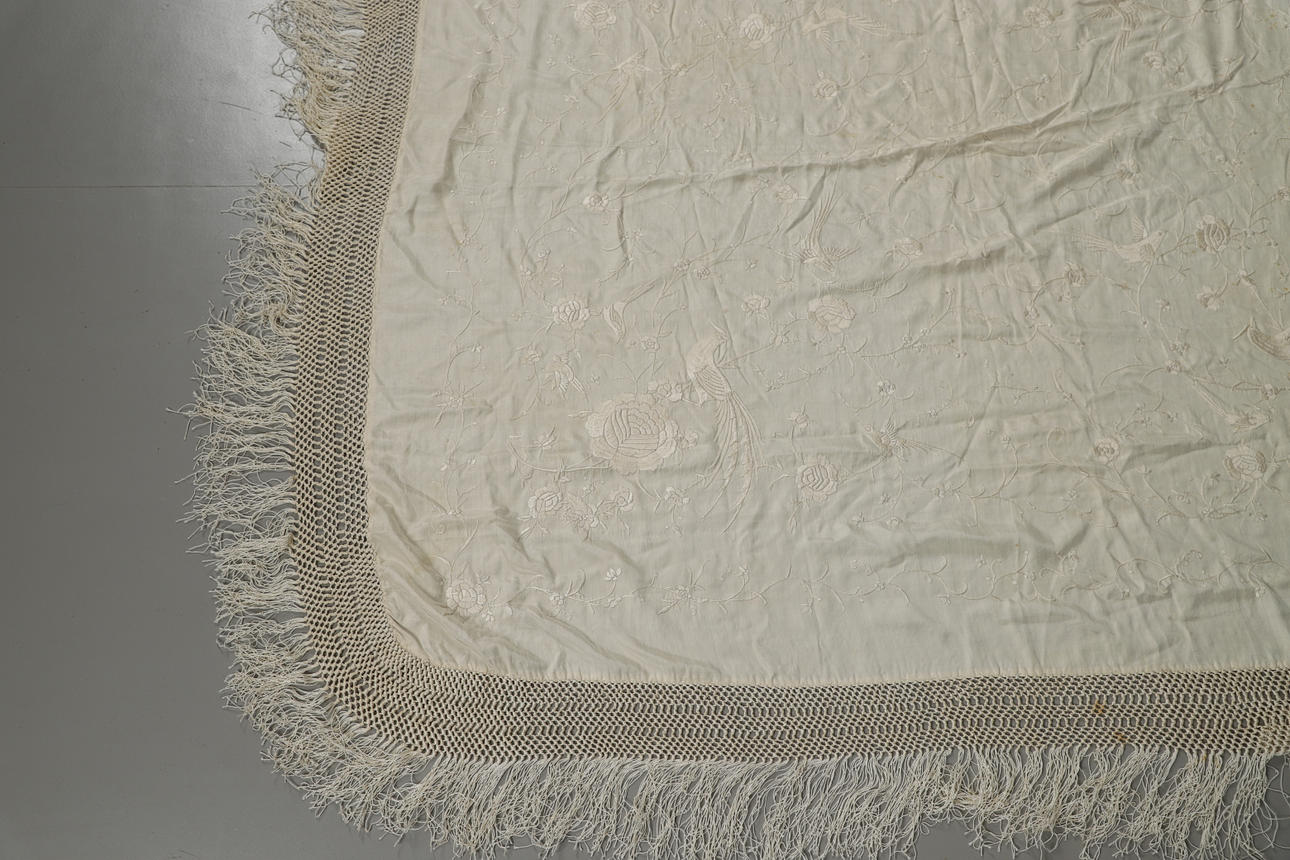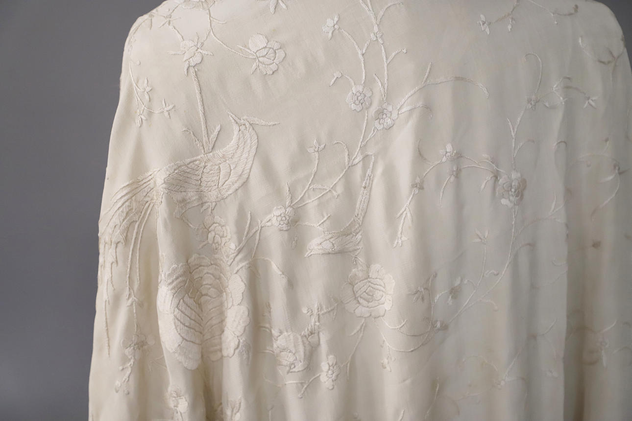 Un chal vintage de seda color crema, bordado con una variedad de pájaros y flores y con un fleco a cada lado. Panel central 121cms por 126cms.