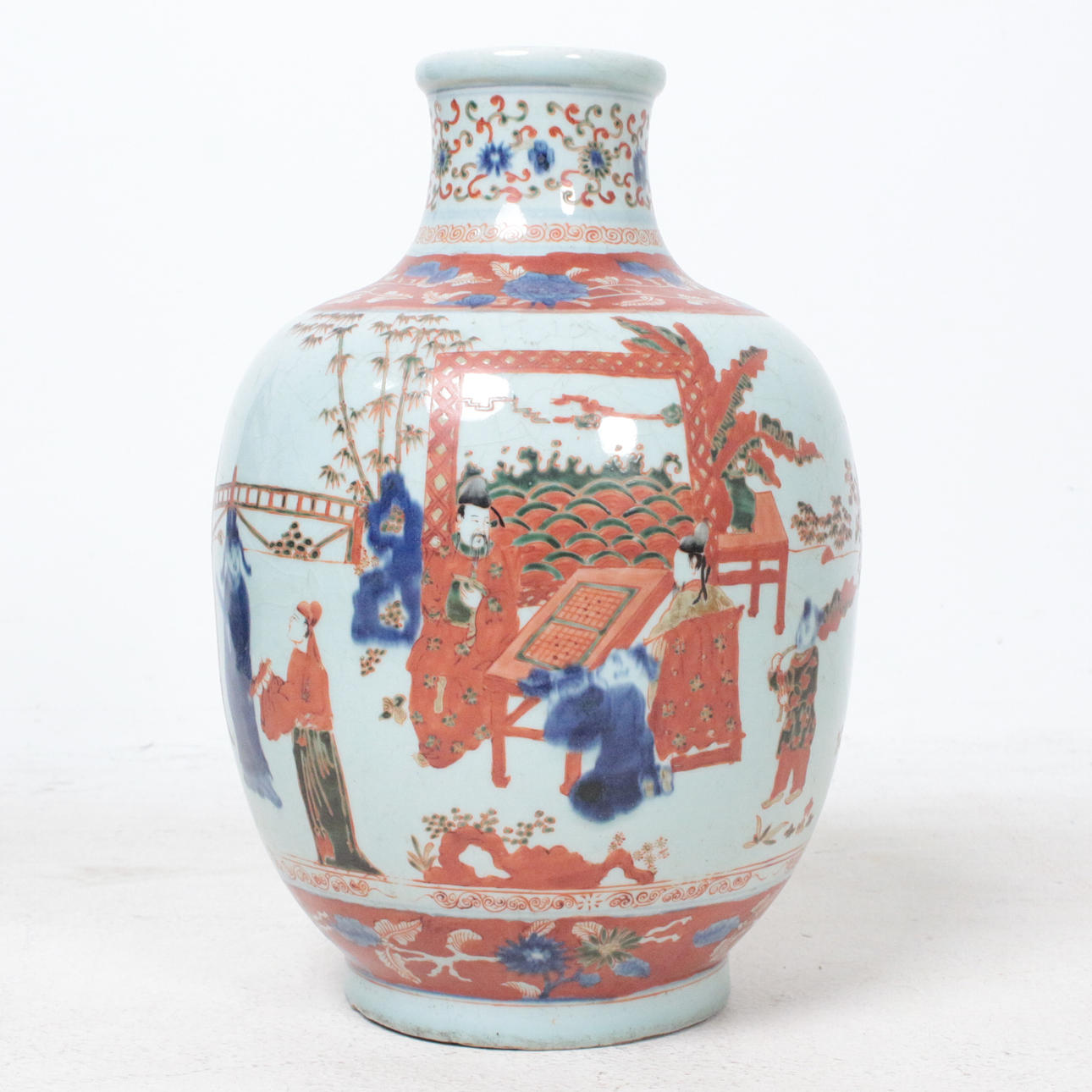 Jarrón de porcelana bulbosa con pintura policromada, dimensiones aprox.: Alt. 39 cm, Ø 24 cm.