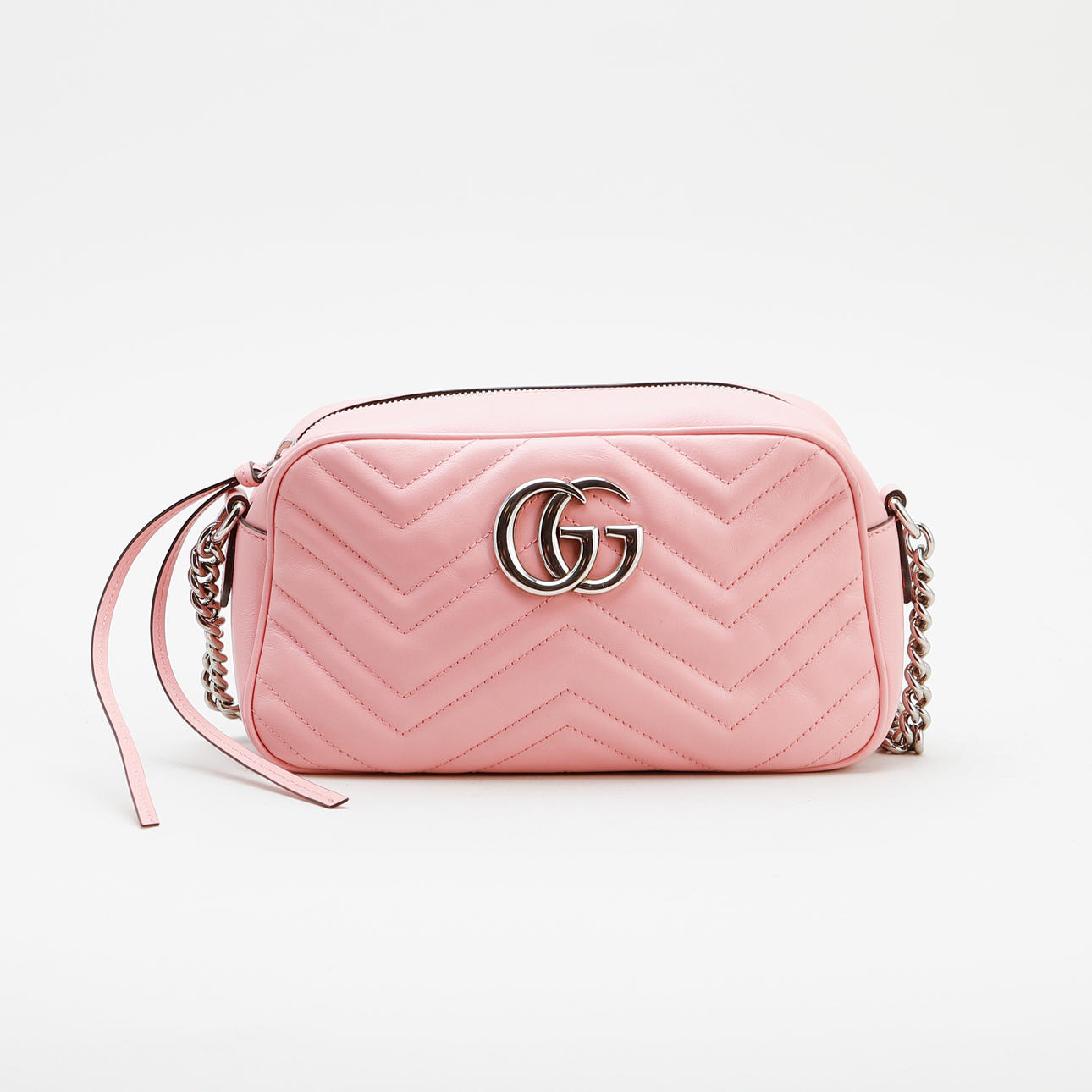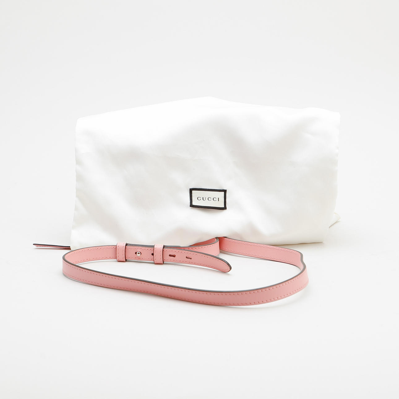 Bolso en piel lacada mate rosa claro. Detalles en metal gris acero. Correa de hombro ajustable. Un compartimento interior. Marcado Gucci hecho en Italia. 24 x 14 x 7 cm. Bolsa de polvo incluida.
