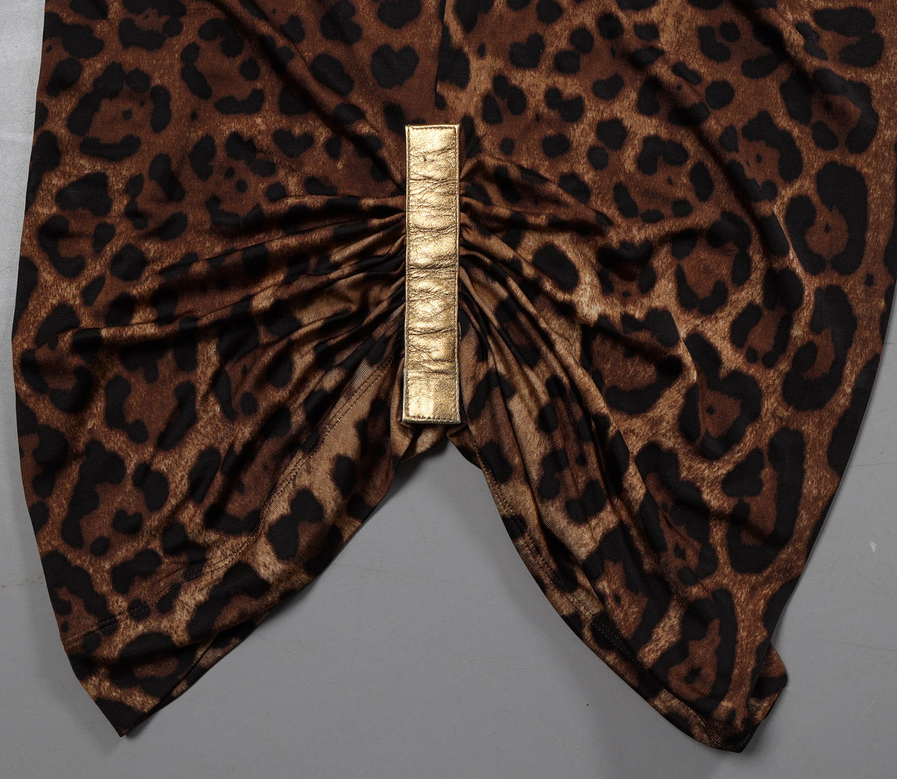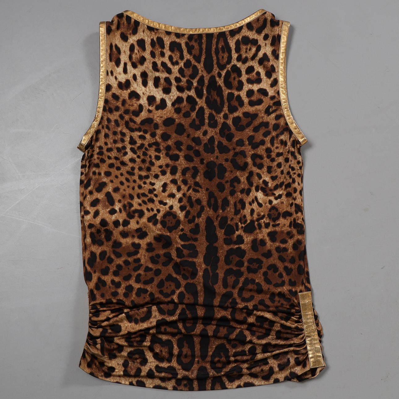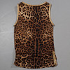 Camiseta de tirantes con estampado de leopardo en rayón con ribete de piel en color dorado. Marcado hecho en Italia, tamaño IT 46.