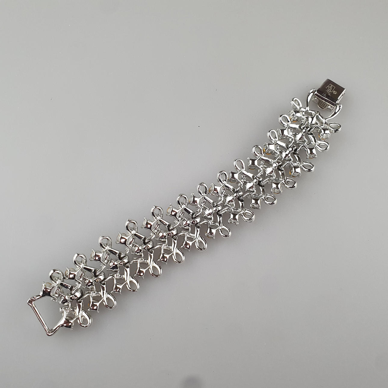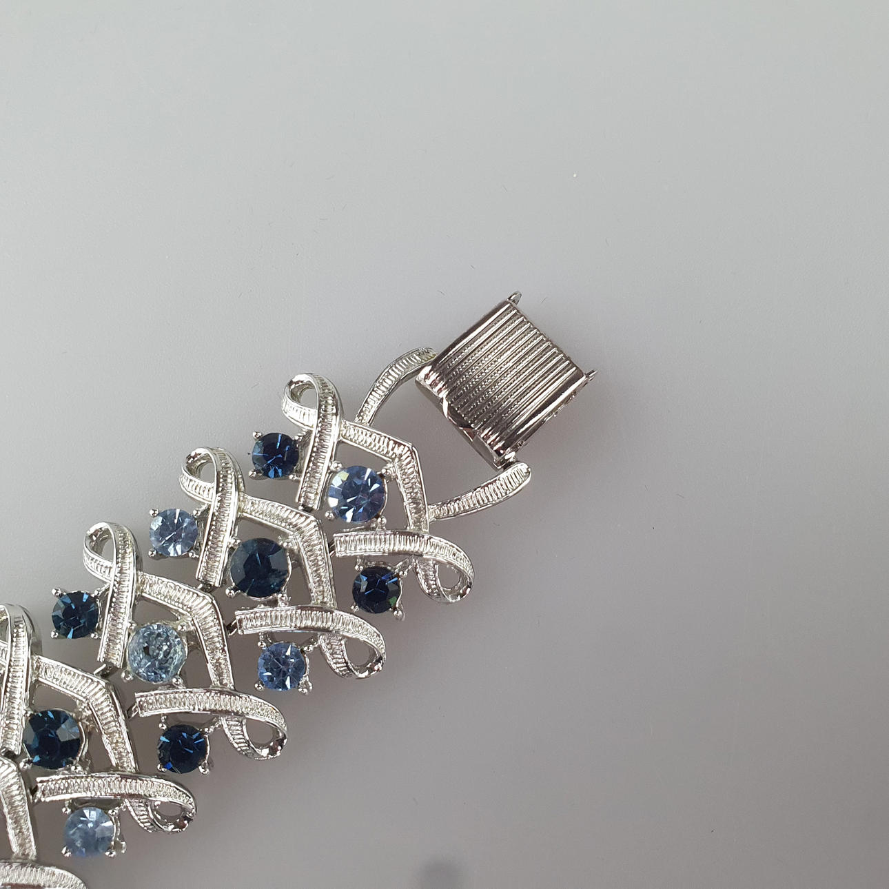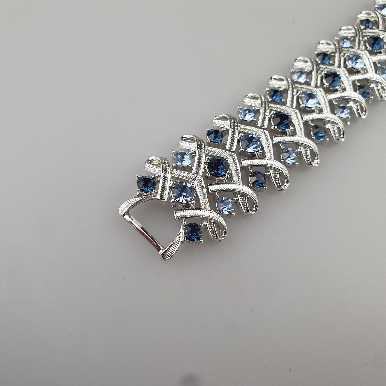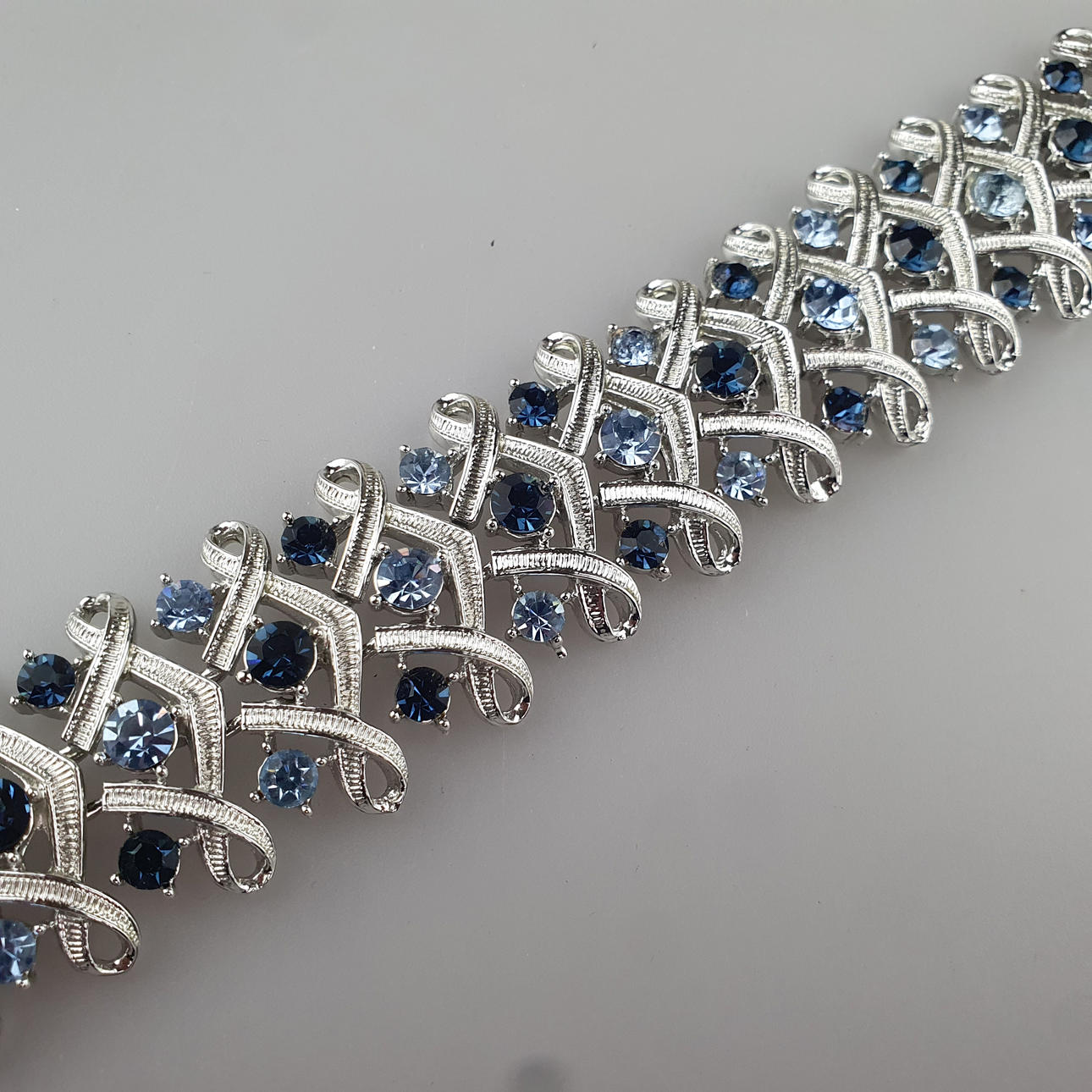divertidos eslabones trenzados de metal plateado engastados con pedrería redonda azul pastel y zafiro, L. aprox. 17 cm, ancho aproximado 2,8 cm, peso aprox. 55g.