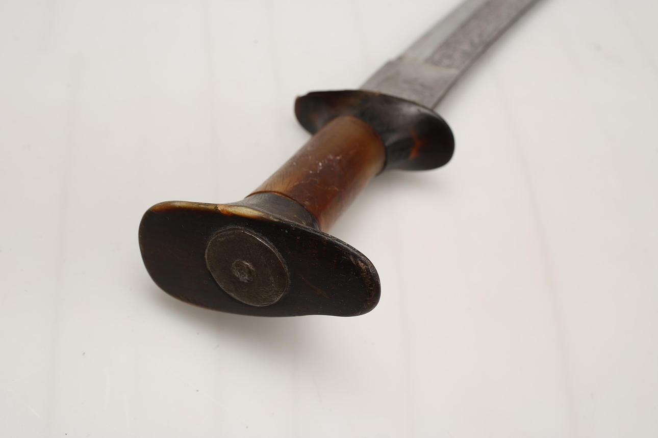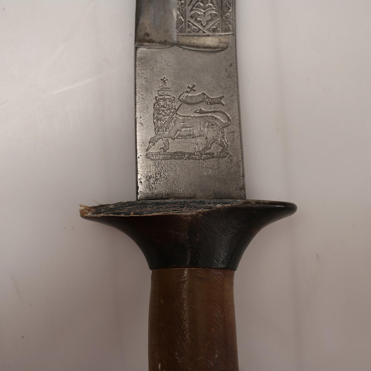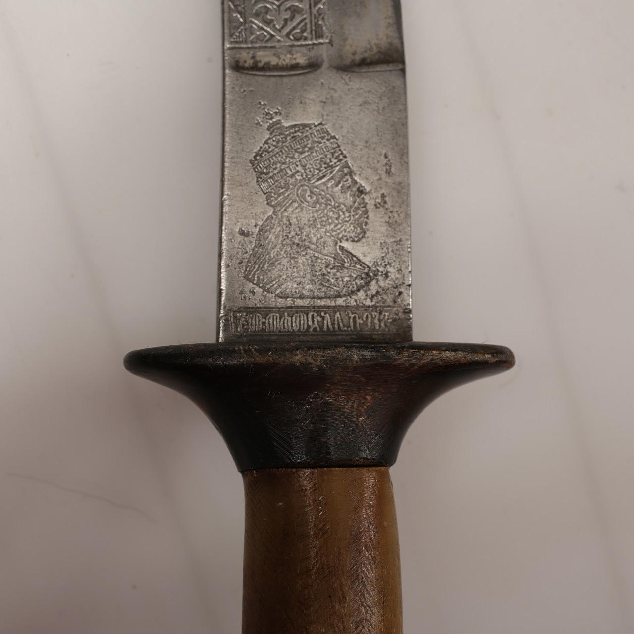 Shotel etíope de 82 cm con hermosos grabados de flores en ambos lados. En la base de un lado la cabeza de perfil del emperador Menelik II (1889-1913), en el otro lado el León de Judha. Empuñadura y empuñadura de hueso.