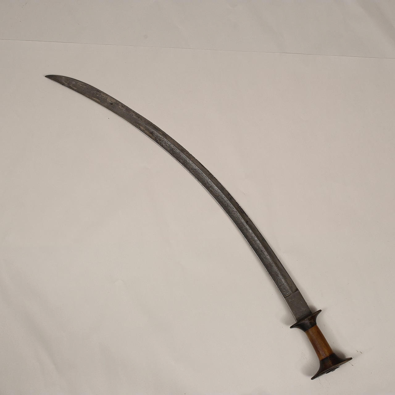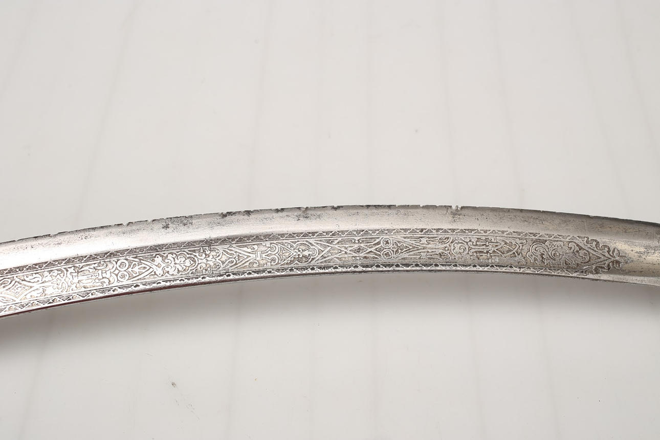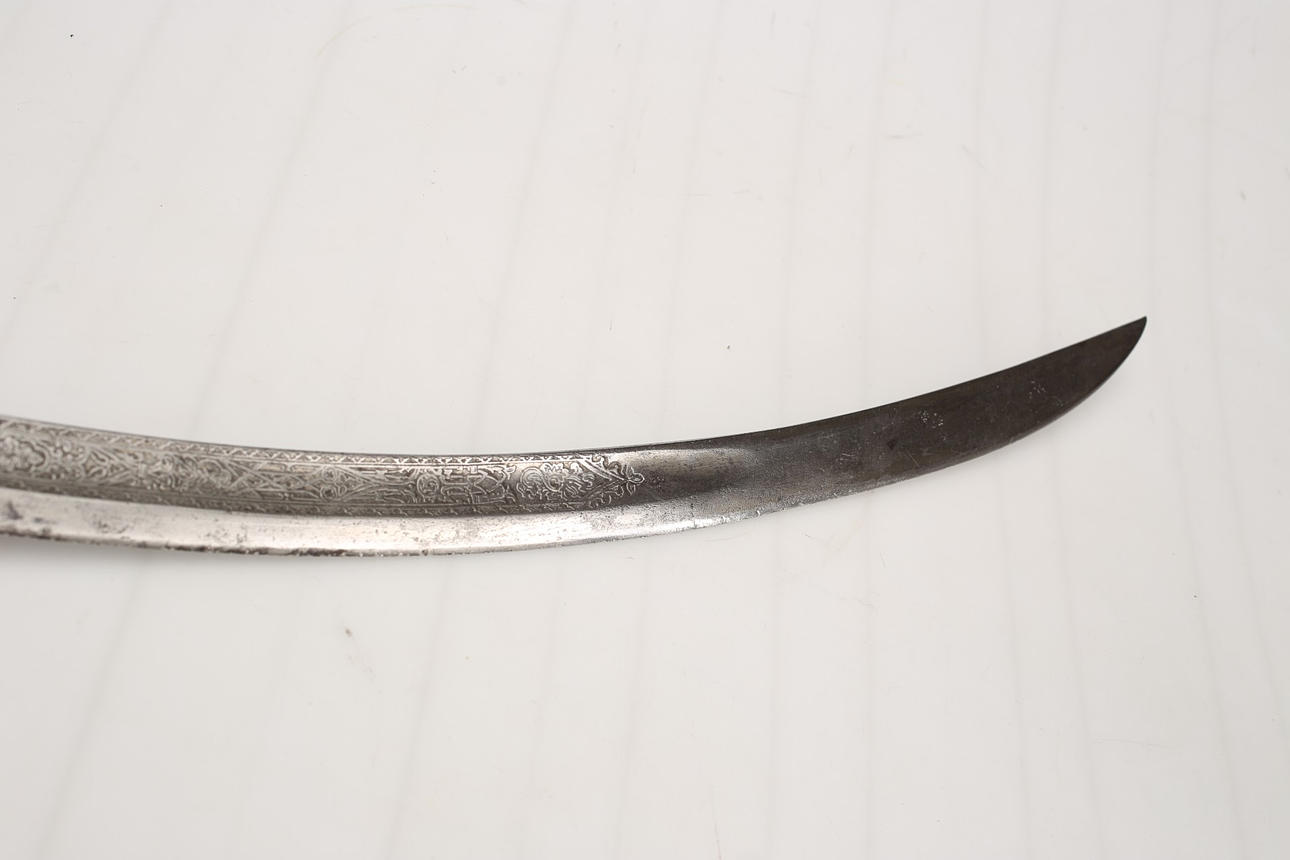 Shotel etíope de 82 cm con hermosos grabados de flores en ambos lados. En la base de un lado la cabeza de perfil del emperador Menelik II (1889-1913), en el otro lado el León de Judha. Empuñadura y empuñadura de hueso.
