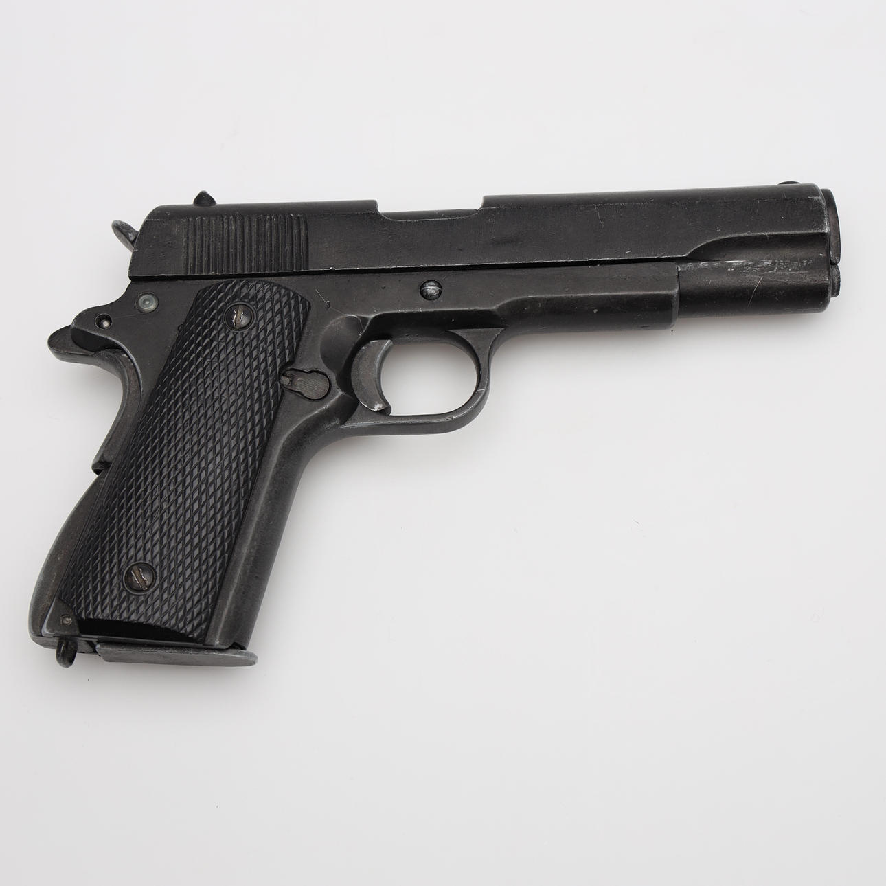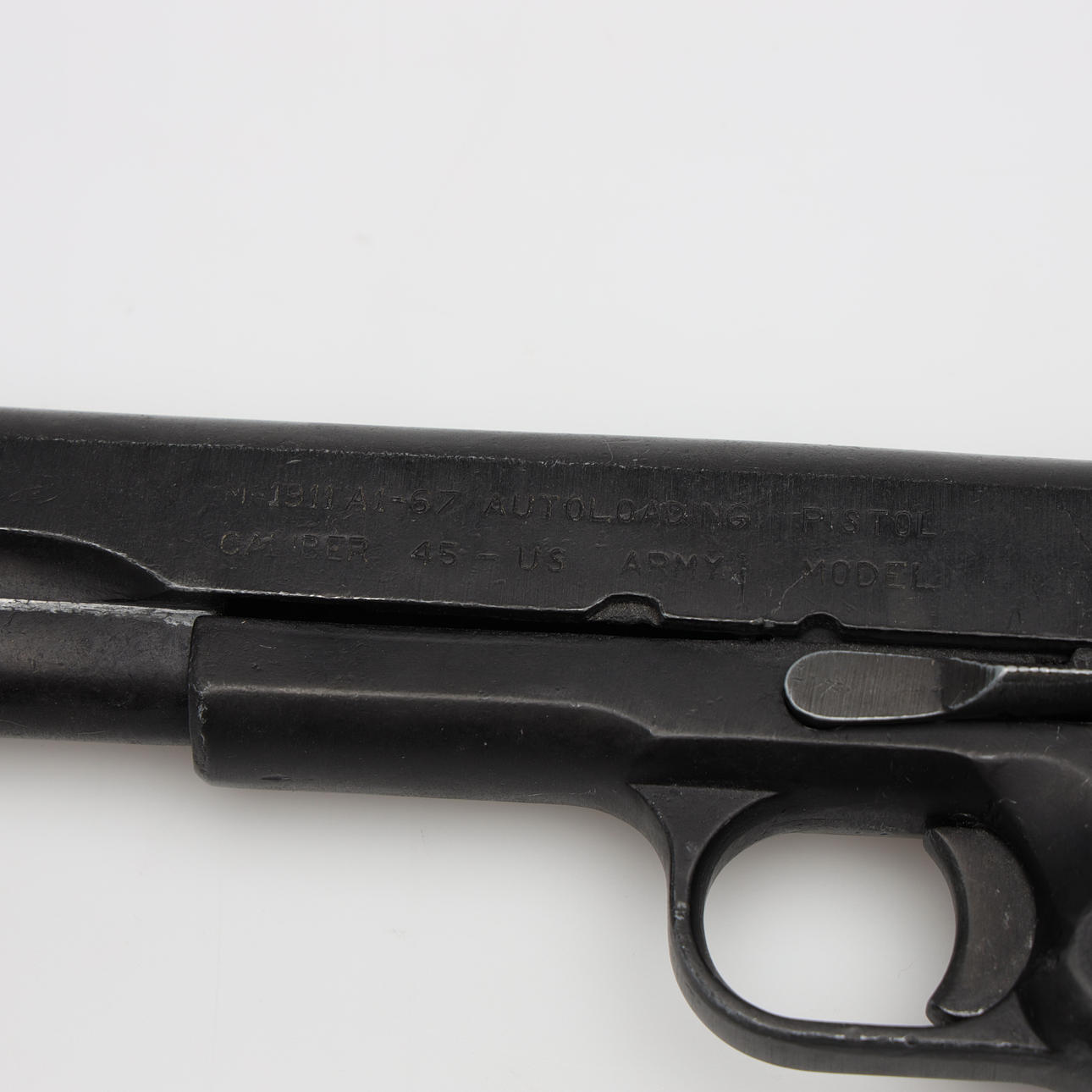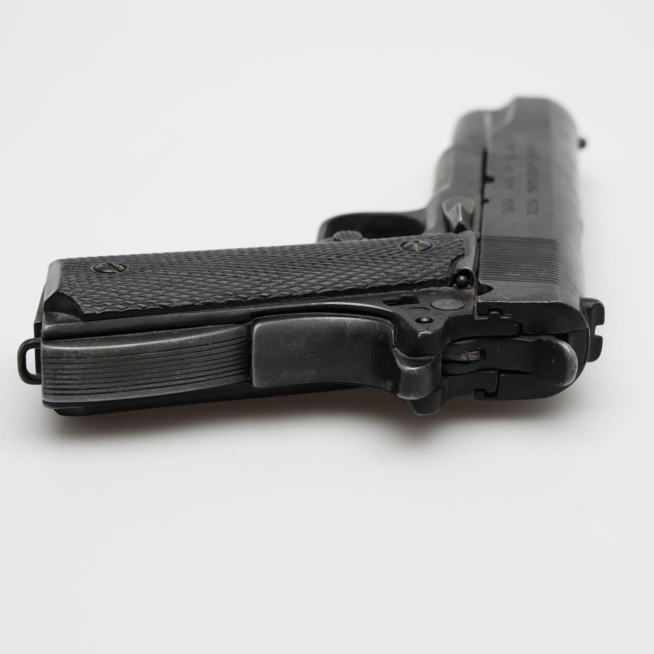 Grabado en los lados con M-1911 A1-67 Pistola de carga automática Calibre 45 Modelo del Ejército de EE. UU. Longitud aproximada 22 cm, altura aproximada 13 cm.