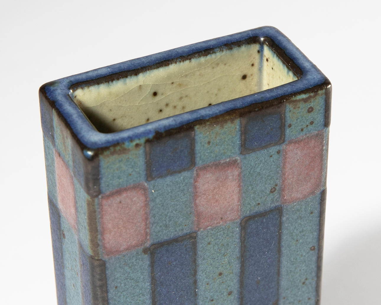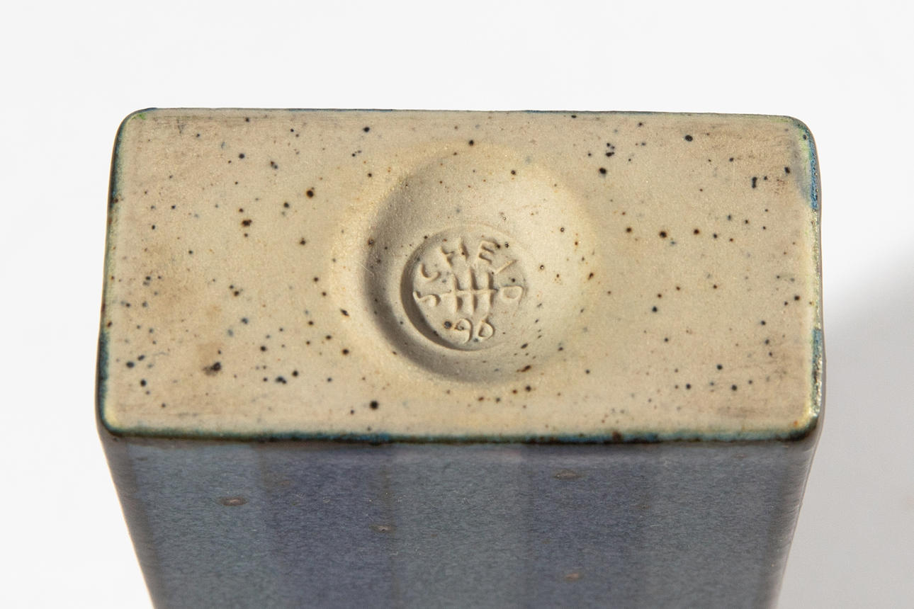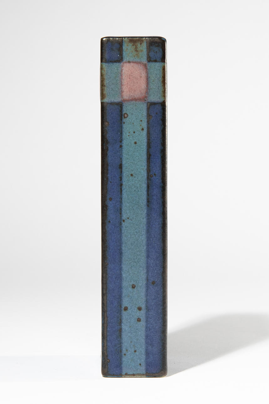 Florero. gres. Decoración de rayas en decoración mate azul-azul-rojo. 16x6x3cm. Marcado en la parte inferior con marca de taller.