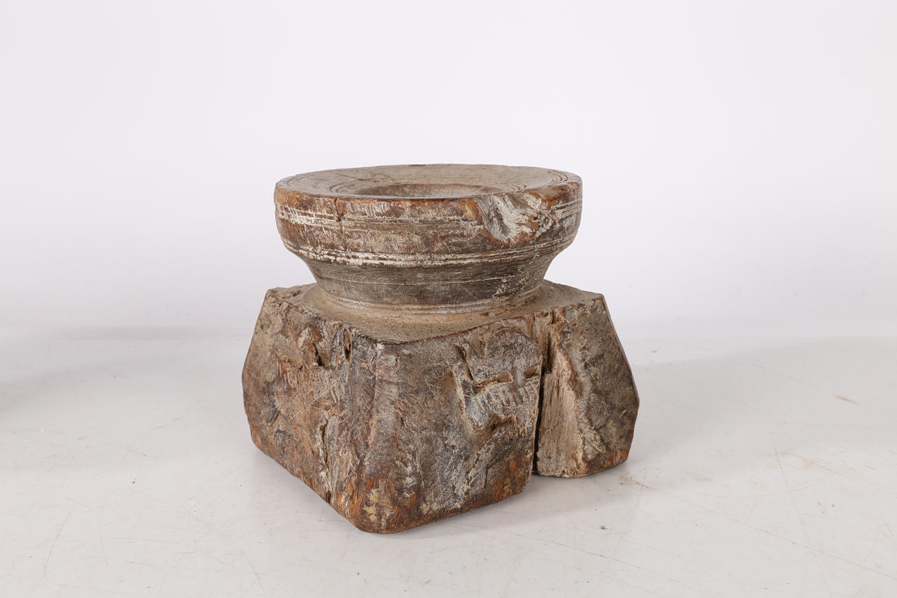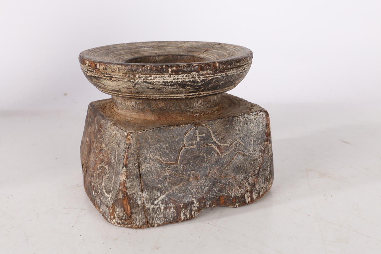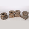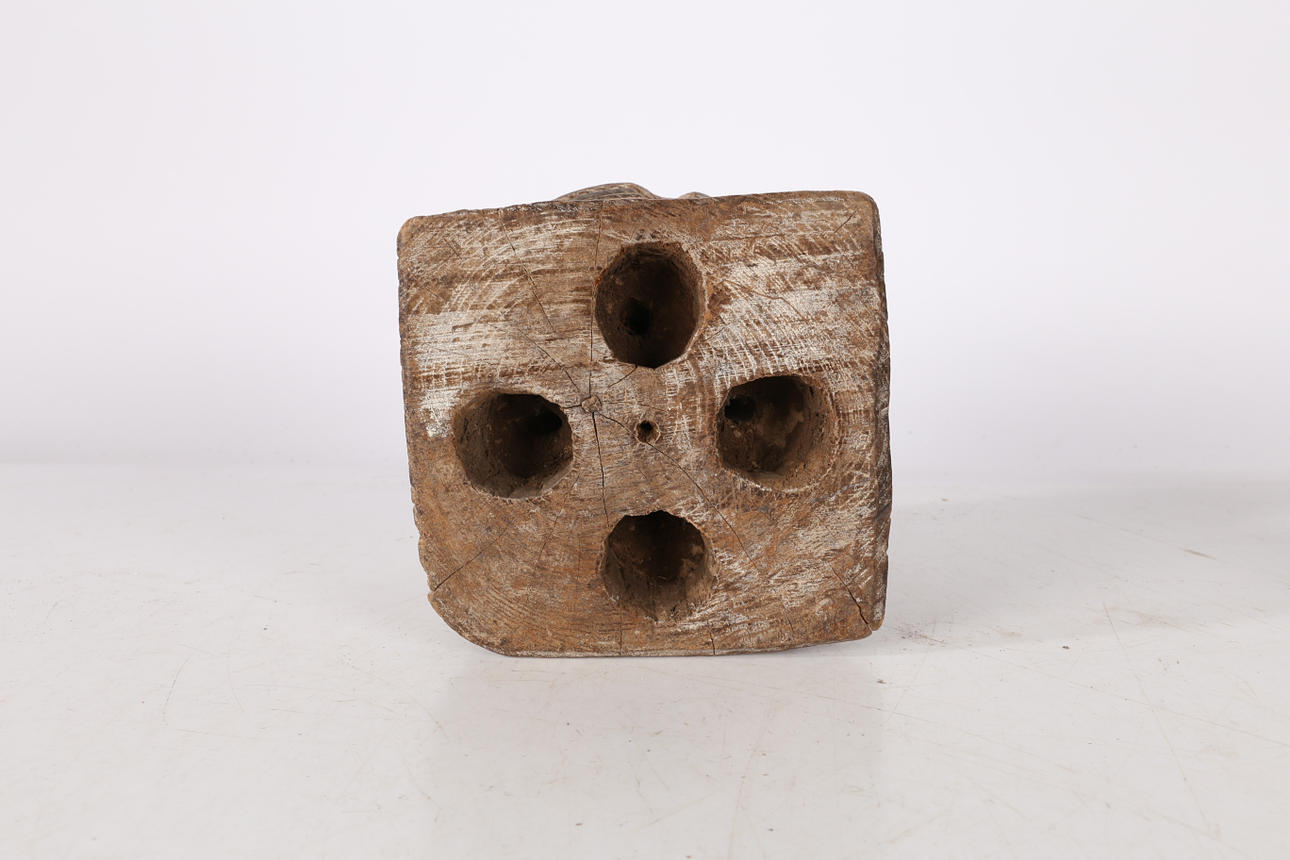 Cuatro poleas de madera, de forma similar, la mayor de 13 cm de alto.