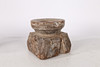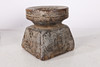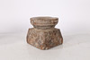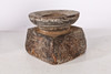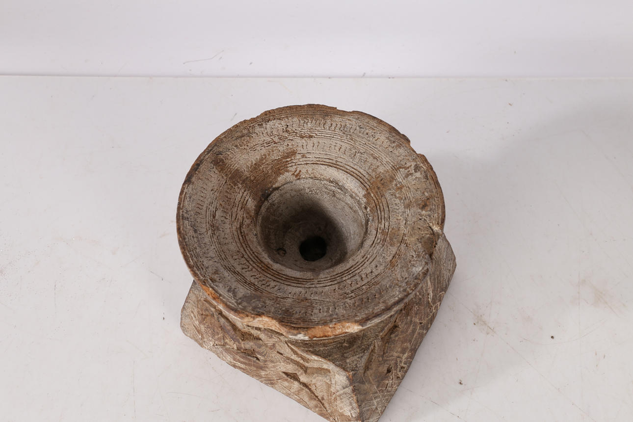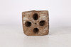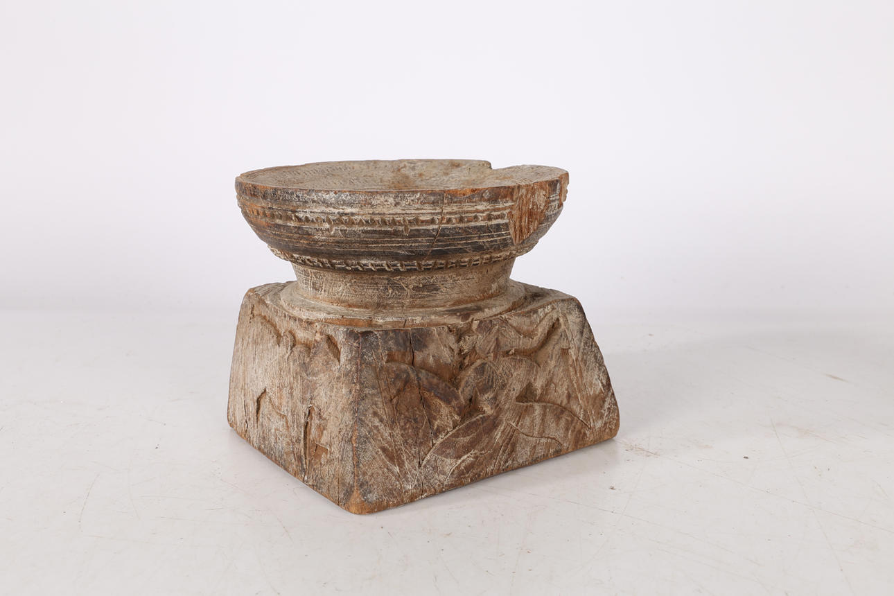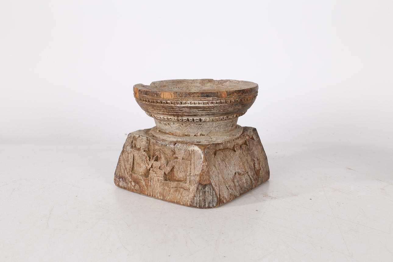 Cuatro poleas de madera, de forma similar, la mayor de 13 cm de alto.