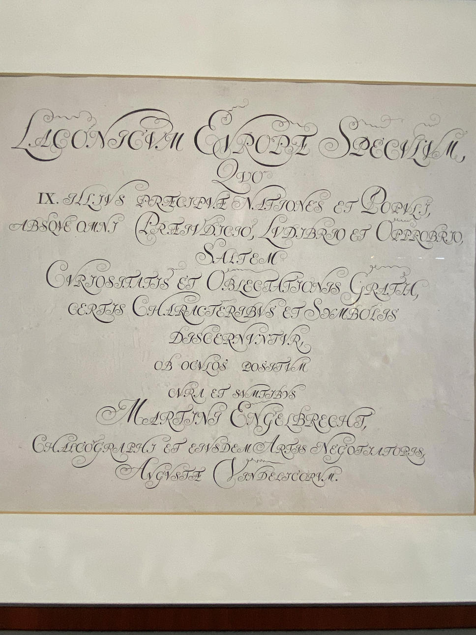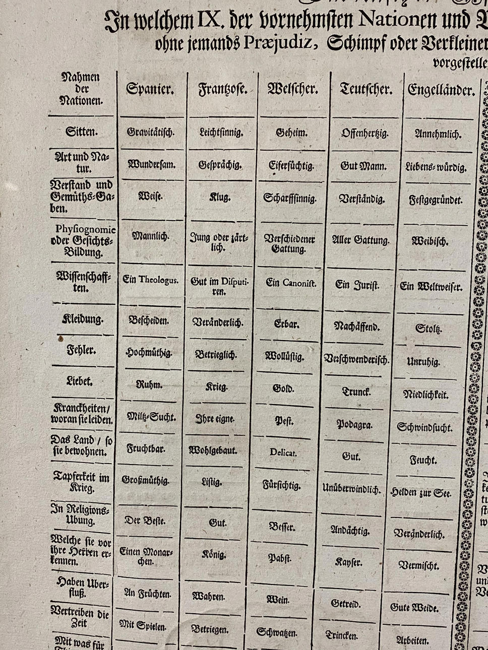 Dos hojas de «Laconicum Europae Speculum», 1 portada en latín «Laconicum Europae Speculum: Quo IX». Illius Praecipuae Nationes Et Populi, Absque Omni Praeiudicio, Ludibrio Et Opprobrio, Saltem Curiositatis Et Oblectationis Gratia, Certis Characteribus Et Symbolis Discernuntur...», impreso por Martin Engelbrecht, 1 portada en alemán «Laconischer Spiegel Europae, en la que IX. de las naciones y pueblos más distinguidos según diferentes distintivos/ sin prejuicios, campanillas o diminutivos de nadie, sino solo por curiosidad y diversión», probablemente impreso por ambas caras, sin enmarcar, enmarcado individualmente con PP bajo vidrio, recorte de PP de aproximadamente 37 x 42 cm, dimensiones del marco exterior de aproximadamente 56 x 61 cm.